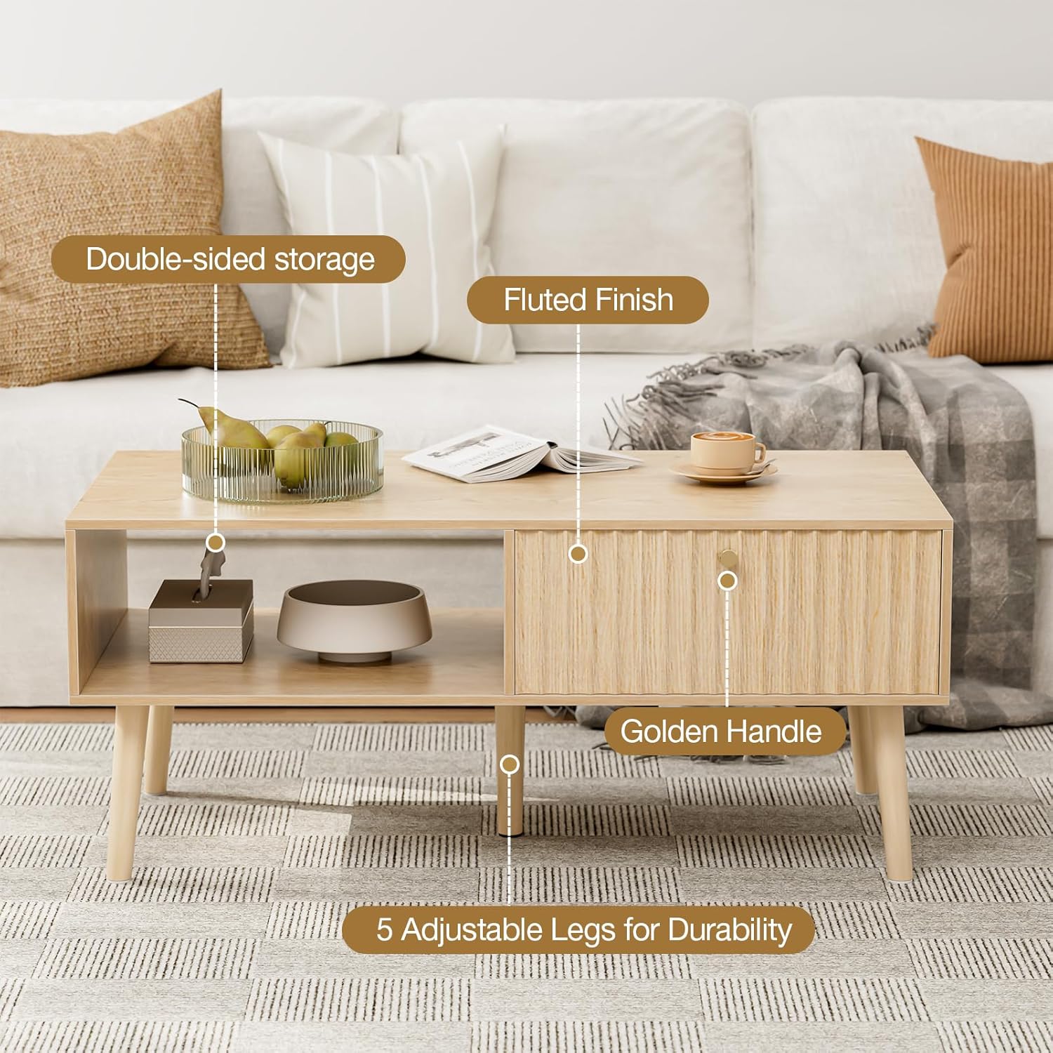 Coffee Table with Storage, Boho Dining Table with Fluted Drawer and Solid Wood Legs, Small Coffee Tables for Living Room, Oak
