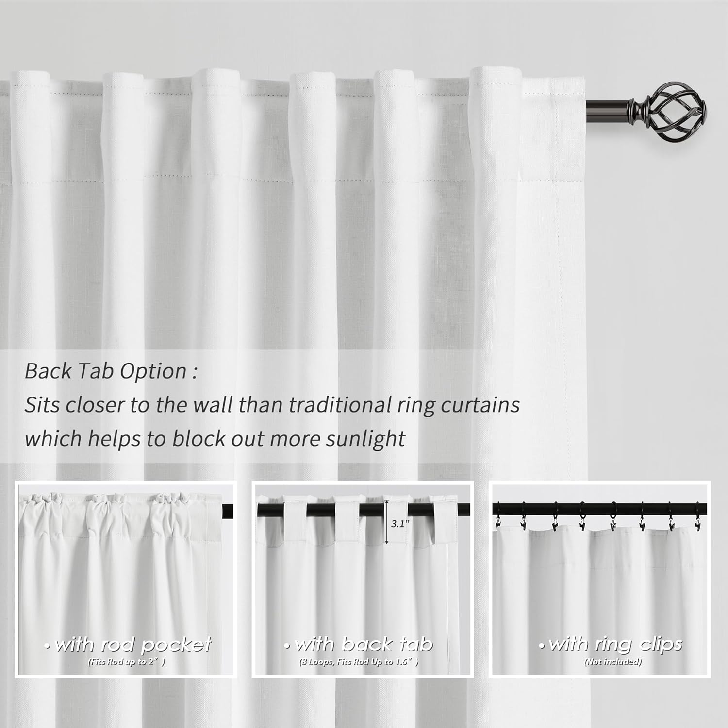 - 3 Hanging Options: Differ from the traditional curtains with grommet, BOODII linen curtains with back tab and rod pocket can full block sunlight fully. (1) Using the back tabs design to create an elegant pleated look and sit closer to the wall than traditional ring curtains, which helps to block out more sunlight; (2) Using rod pocket for a classic effect; (3) Using clip rings on track system or curtain rod, slide open/closed easily (clip rings are not included).