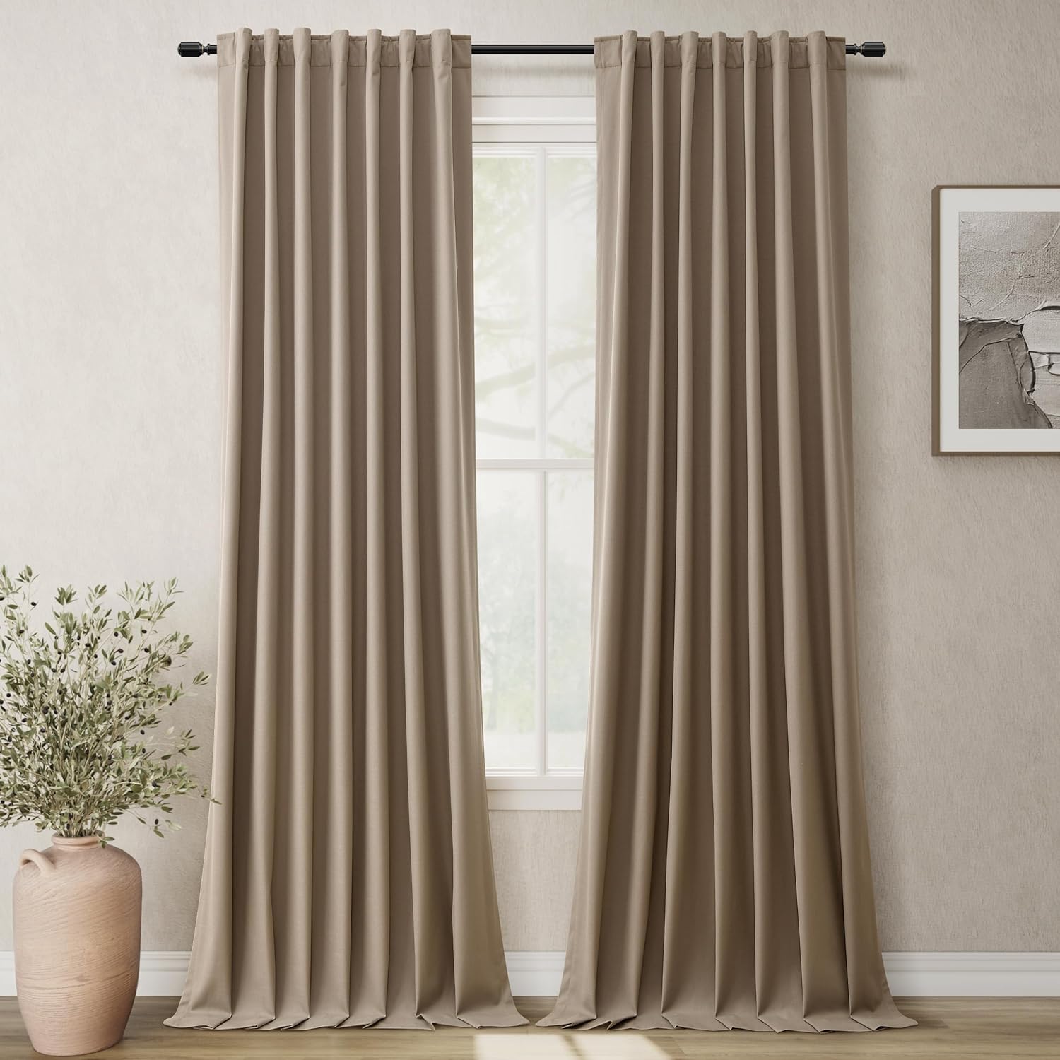 - Thermal Insulated Room Darkening Curtains: The blackout curtains with 300GSM high-density linen blend fabric block out the heat in summer and cool air in winter while sunlight blocking and soundproof. Provide a easy and comfortable home.