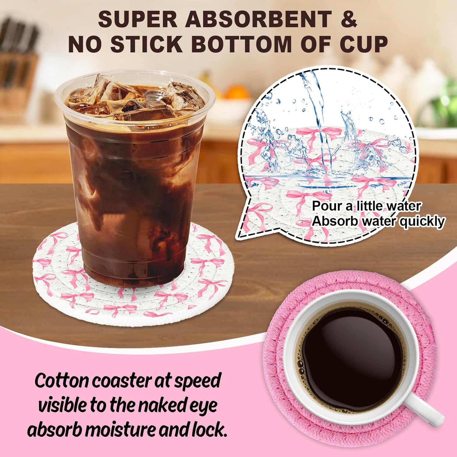 Whaline Pink Bow Coasters Handmade Braided Cotton Coasters Round Absorbent Bowknot Coquette Drink Mats for Breast Cancer Awareness Birthday Wedding Baby Shower Party Home Office Table Decor, Set of 4