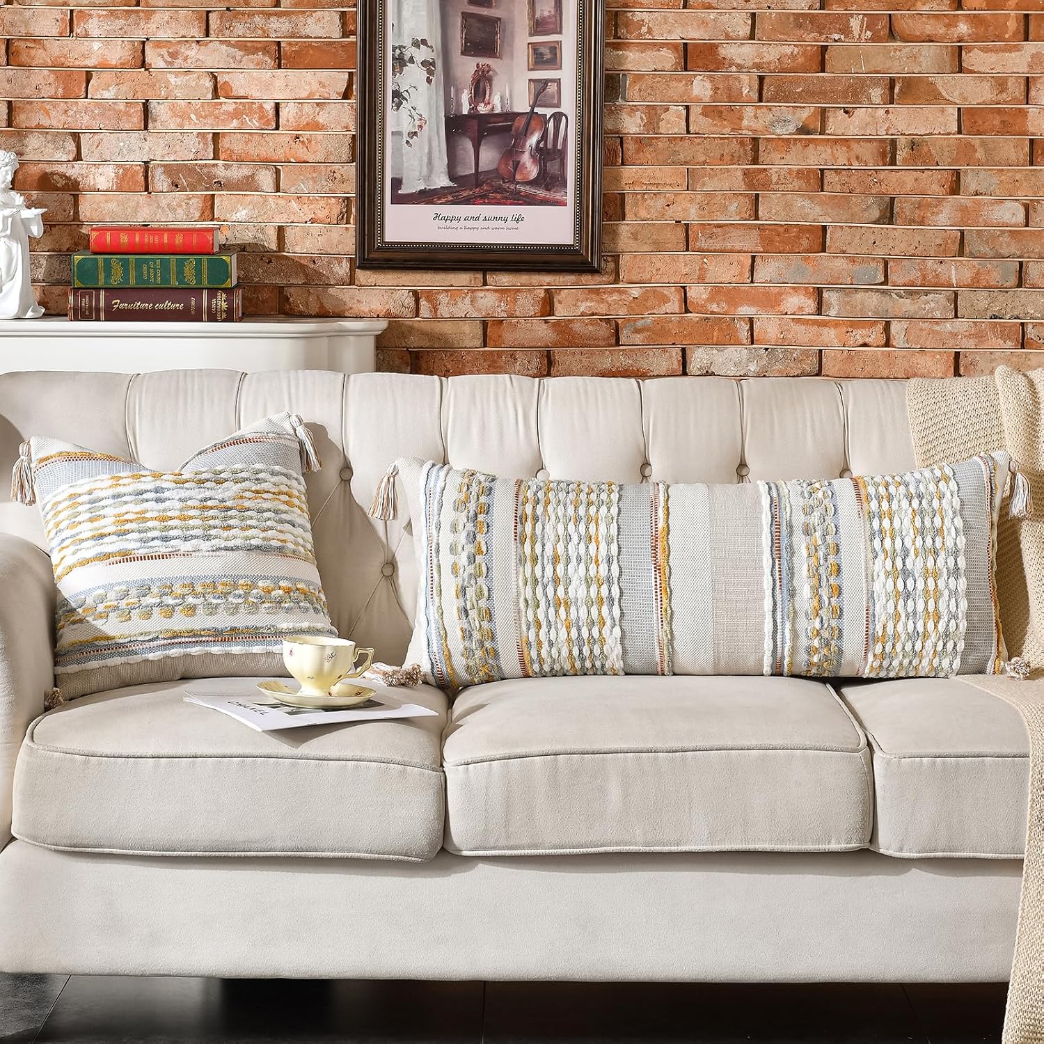 AmHoo Chenille Striped Textured Boho Throw Pillow Covers Aesthetic with Tassels Woven Decorative Pillow Case for Couch Bed Sofa Bedroom Modern Funky 14 x 36-Inch Grey