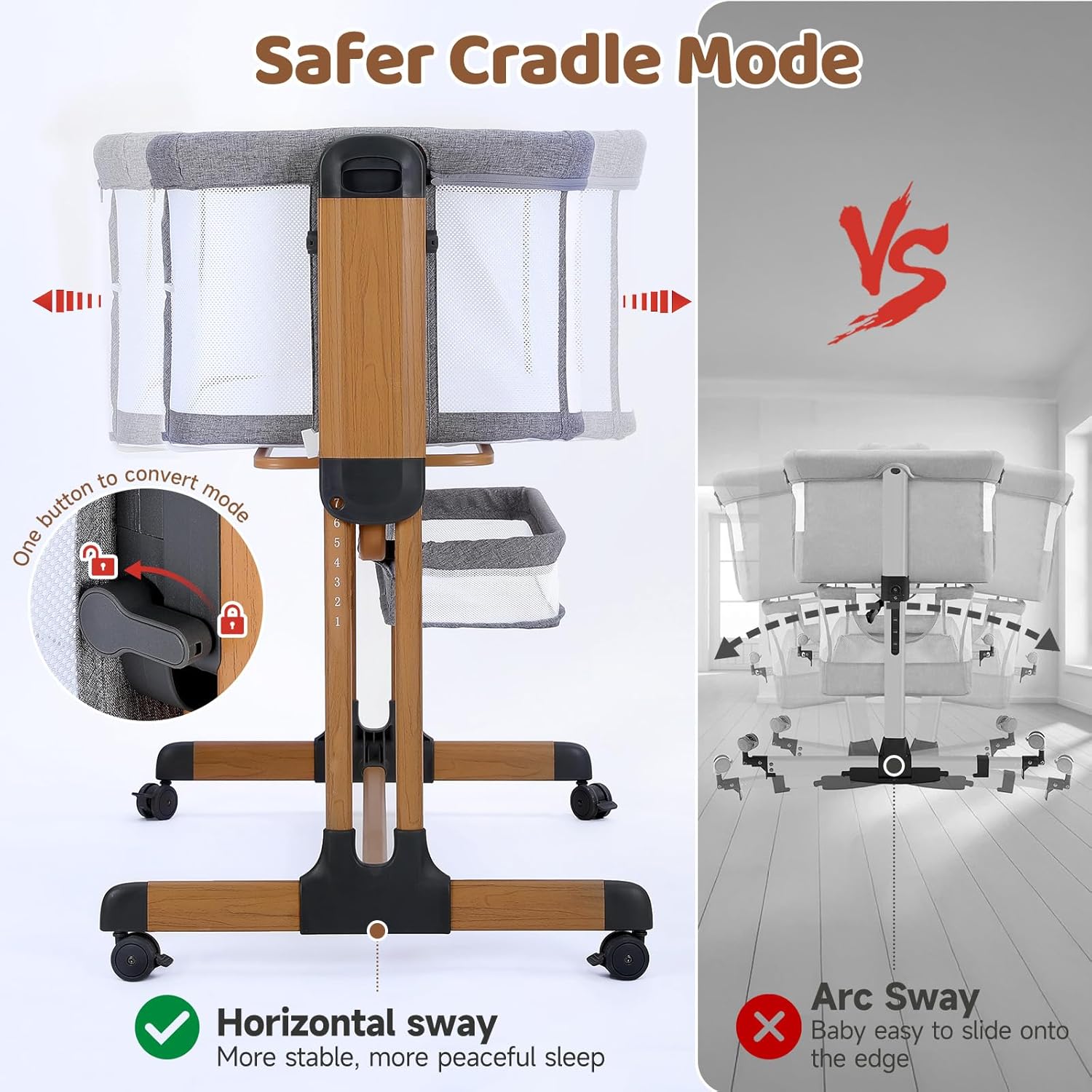 - ăBaby Bassinet with Wheelsă The baby bassinets bedside sleeper is equipped with four lockable 360°swiveled wheels, allowing for easy mobility around bedrooms and living rooms.