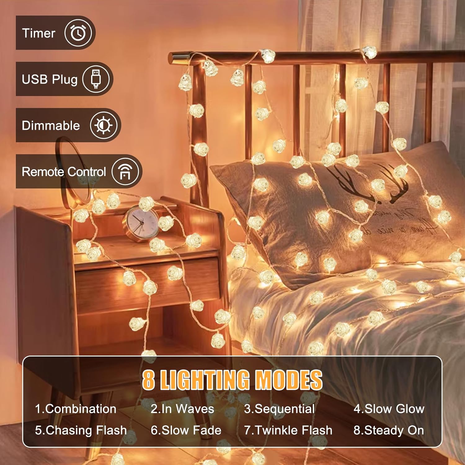 - 【USB Plug String Lights】 Rose string lights are powered by USB interface,more convenient and economical, the low voltage of 5V protects your babies and pets for touching those string lights. Both a long service life without the trouble of replacing batteries frequently