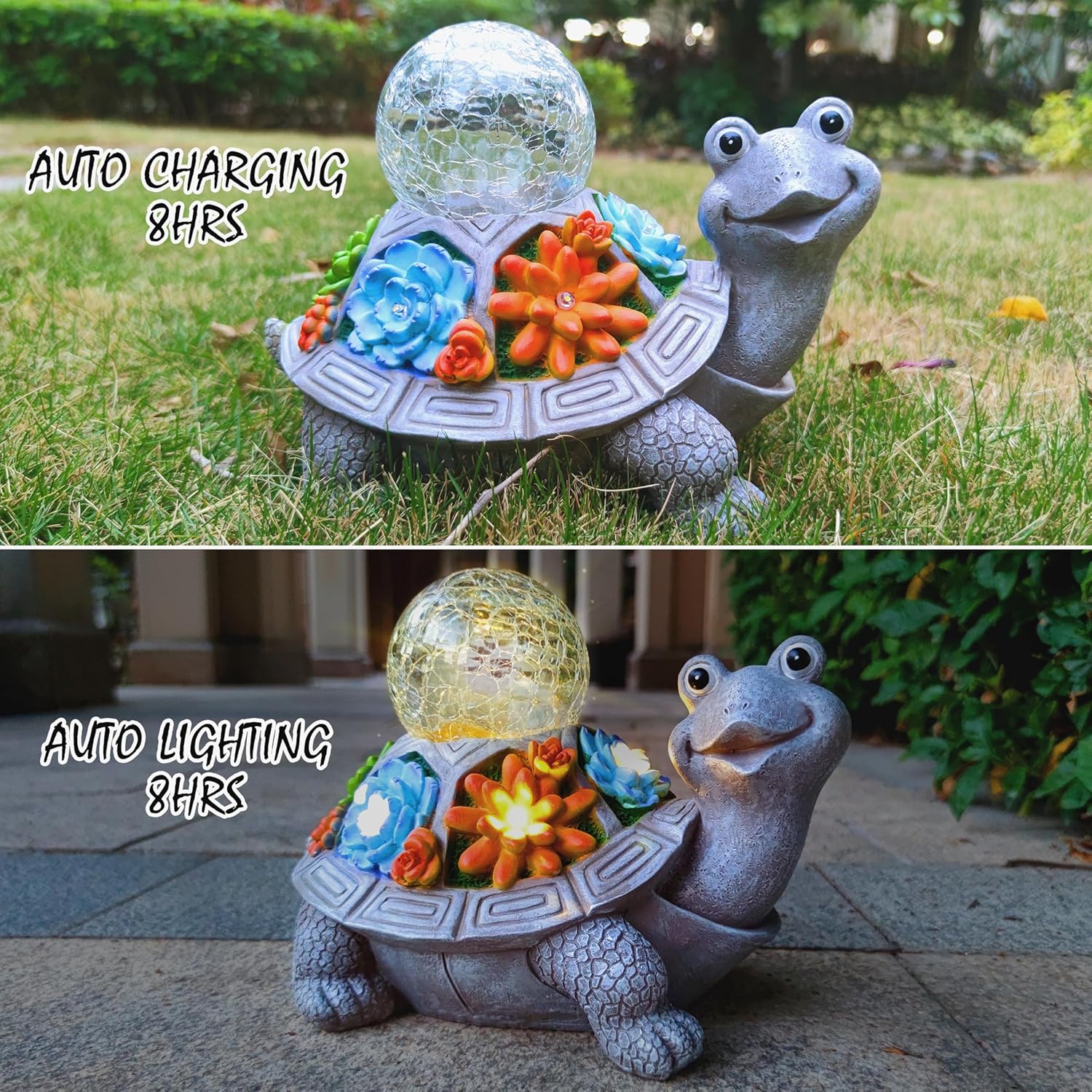 - 【Unique design】This charismatic turtle gracefully holding a solar lantern, adds a touch of magic to your outdoor space, casting a warm and welcoming glow.The size of this turtle figurine is 9.8X6.3X4.1inches,the lantern is 5.5X2.75X2.75inches.The turtle figurines made of resin material, hand-painted and finished with a UV resistant coating can withstand rain, snow or scorching sun without fading.