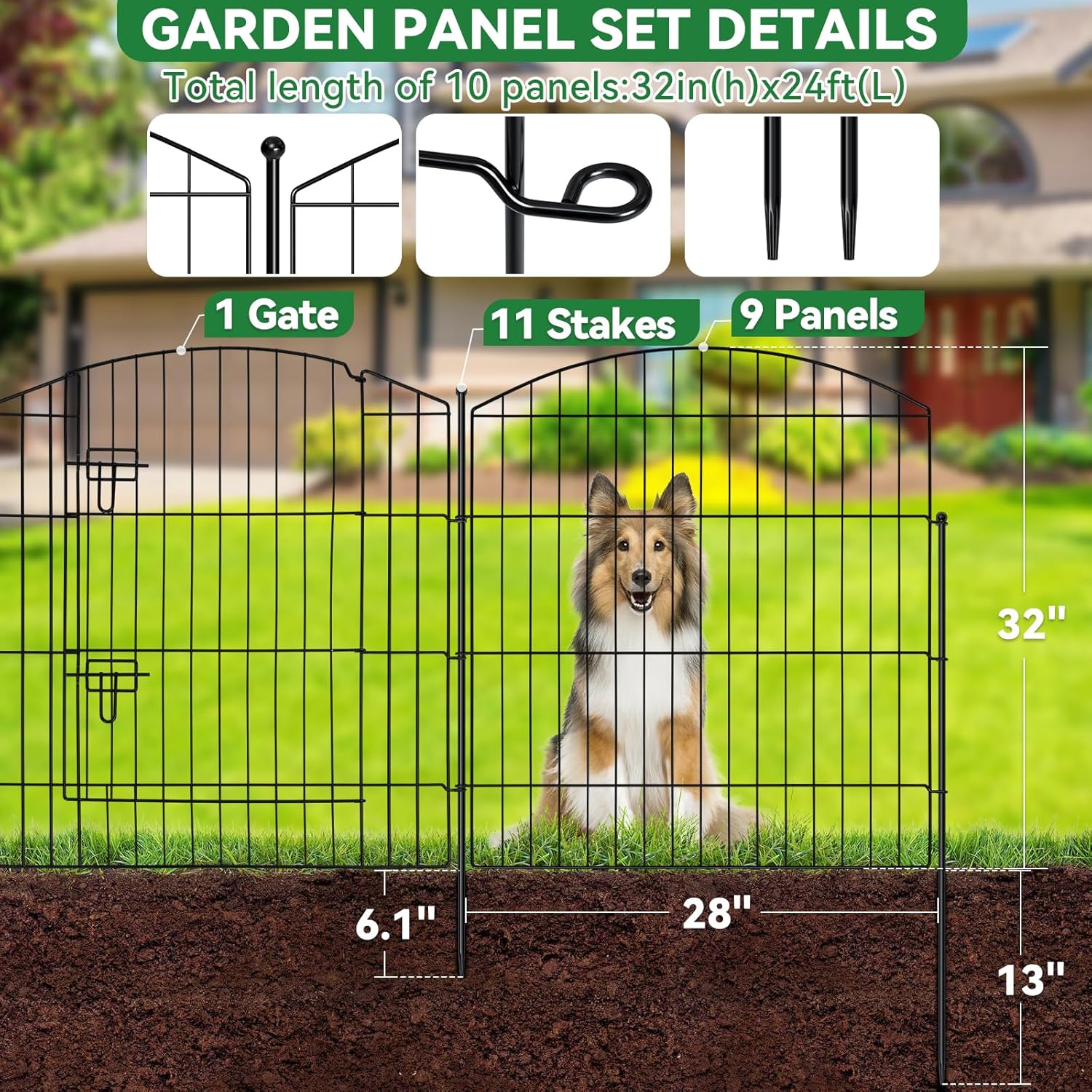 No Dig Decorative Garden Fence with Gate 32in (H) x 24ft (L), 9 Panels + 1 Gate +11 Stakes, Temporary Dog Fencing Outdoor, Rustproof Metal Arched Animal Barrier for Yard, Patio, Flower Bed, Landscape