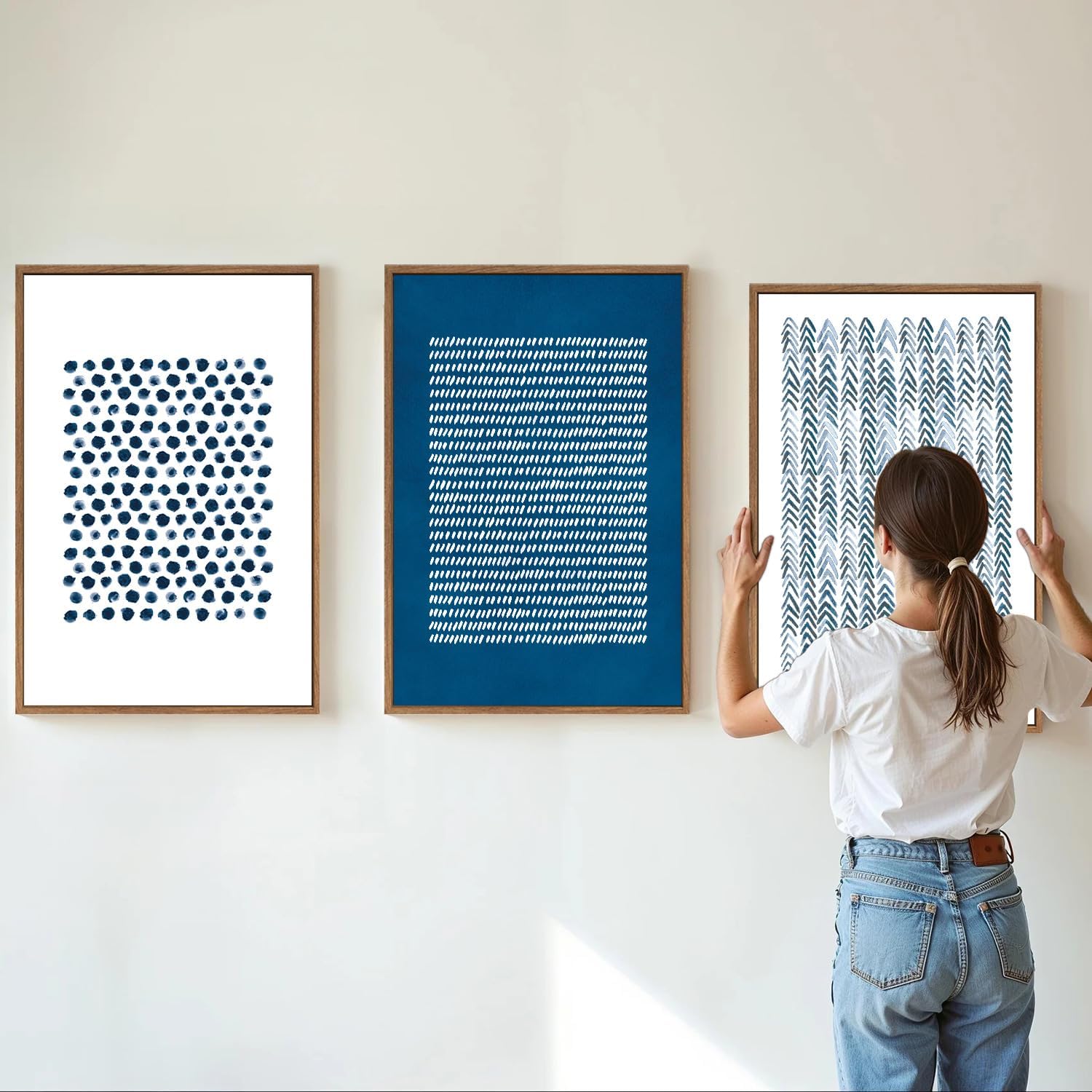 - Sleek Minimalist Design: This art set features a contemporary minimalist style with an abstract collage of navy light blue and white dots and lines, making it an ideal choice for those who appreciate simplicity and elegance in their home decor.