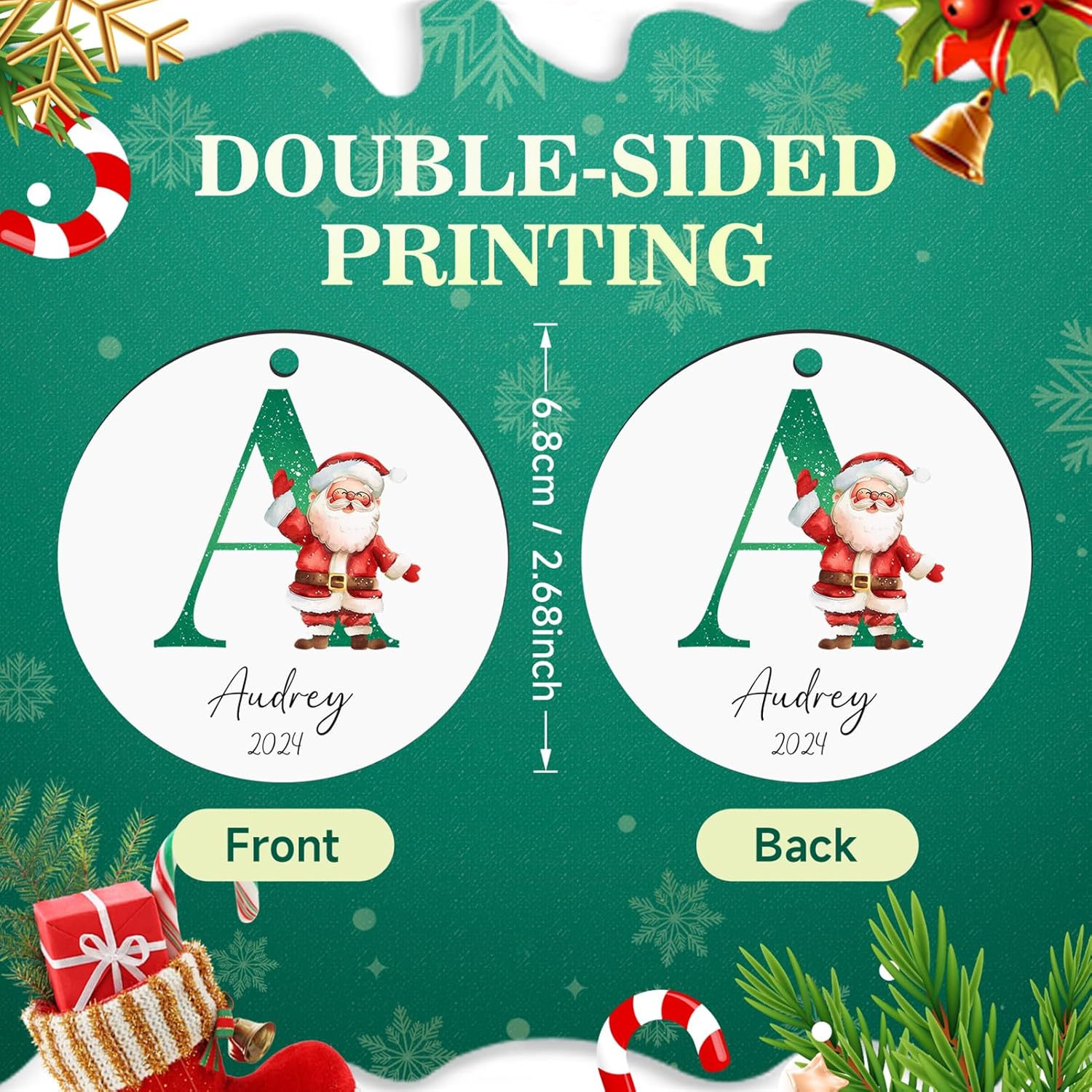 - 【Double-Sided HD Printing Christmas ornament Personalized】Custom Christmas ornament for Christmas tree use HD printing technology, double-sided printing the same, bright colors,not easy to fade.About 2.68", you can type the family member name,we will print the name on the custom ornament, give personalized family ornament to him or her as Christmas gift ideas