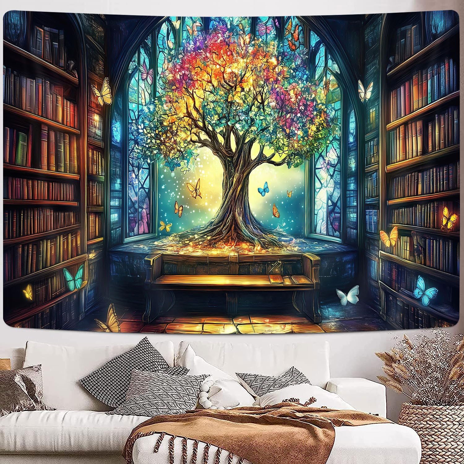 Mysterious Library Tapestry, Fantasy Enchanted Tree Magic Bookshelf Aesthetic Tapestries for Classroom, Witchy Fairy Tree Vintage Bookshelf Book Art Tapestry Wall Hanging College Room Bedroom, 80X60