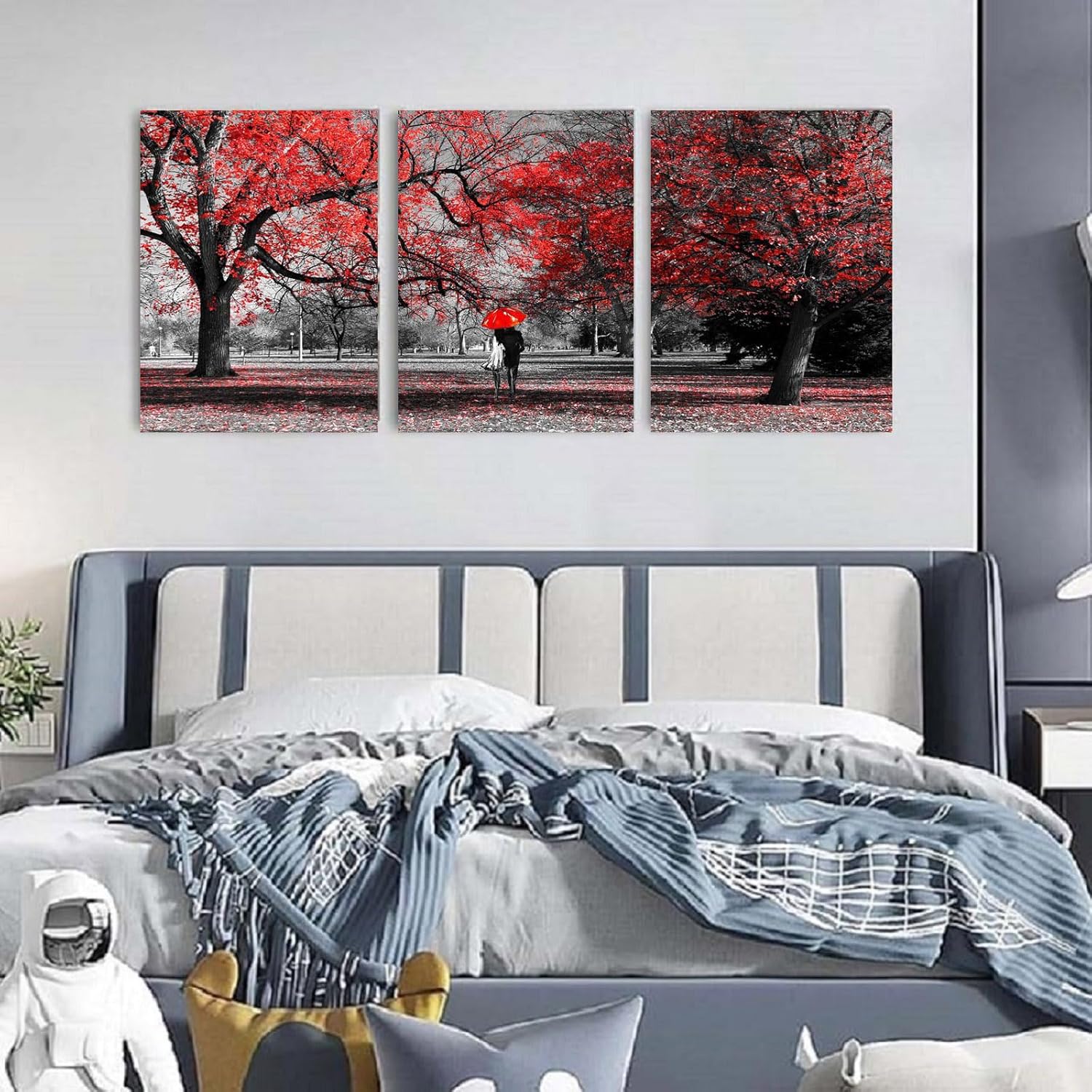 - 🍁🍂 Red Wall DecorTree landscape Wall Art Size: 12x16inchesx3Pcs(30x40cmx3Pcs) Red Bathroom Painting Prints Framed Ready to Hang