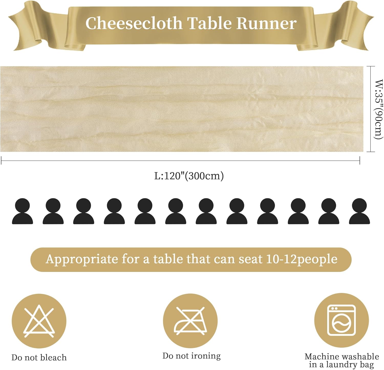 - ✿【PACKAGE INCLUDED】You will receive the cheesecloth table runners. Elegant and beautiful design, exquisite workmanship. Product size: Each boho table runner is 35 x 120 inches. Enough to cover rectangles and round tables, as well as long tables that are stitched together. It can even be used to belt chairs decorate napkins, background curtains. Round or square tables for 8-10 people, perfect for romantic and elegant party events.
