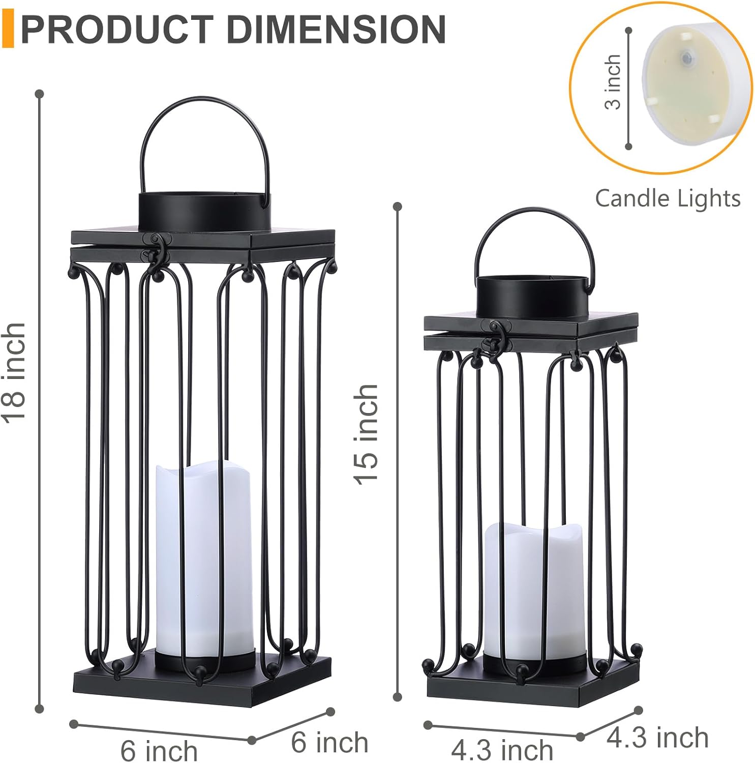 Solar Lantern Decorative Outdoor Set of 2 (18’’ & 15’’) Modern Black Metal Lanterns with Solar Candles, Decorative Candle Lanterns for Outdoor Porch, Patio, Garden, Yard Decor