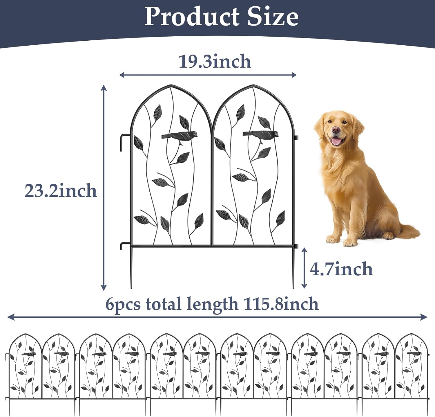 - Vintage Retro Style: : Single piece measures 23" high x 19" wide, pack of 6 panels, It's 10 ft long to connect all of them. This wrought iron fence is made of high quality metal material, sturdy for years of outdoor use.