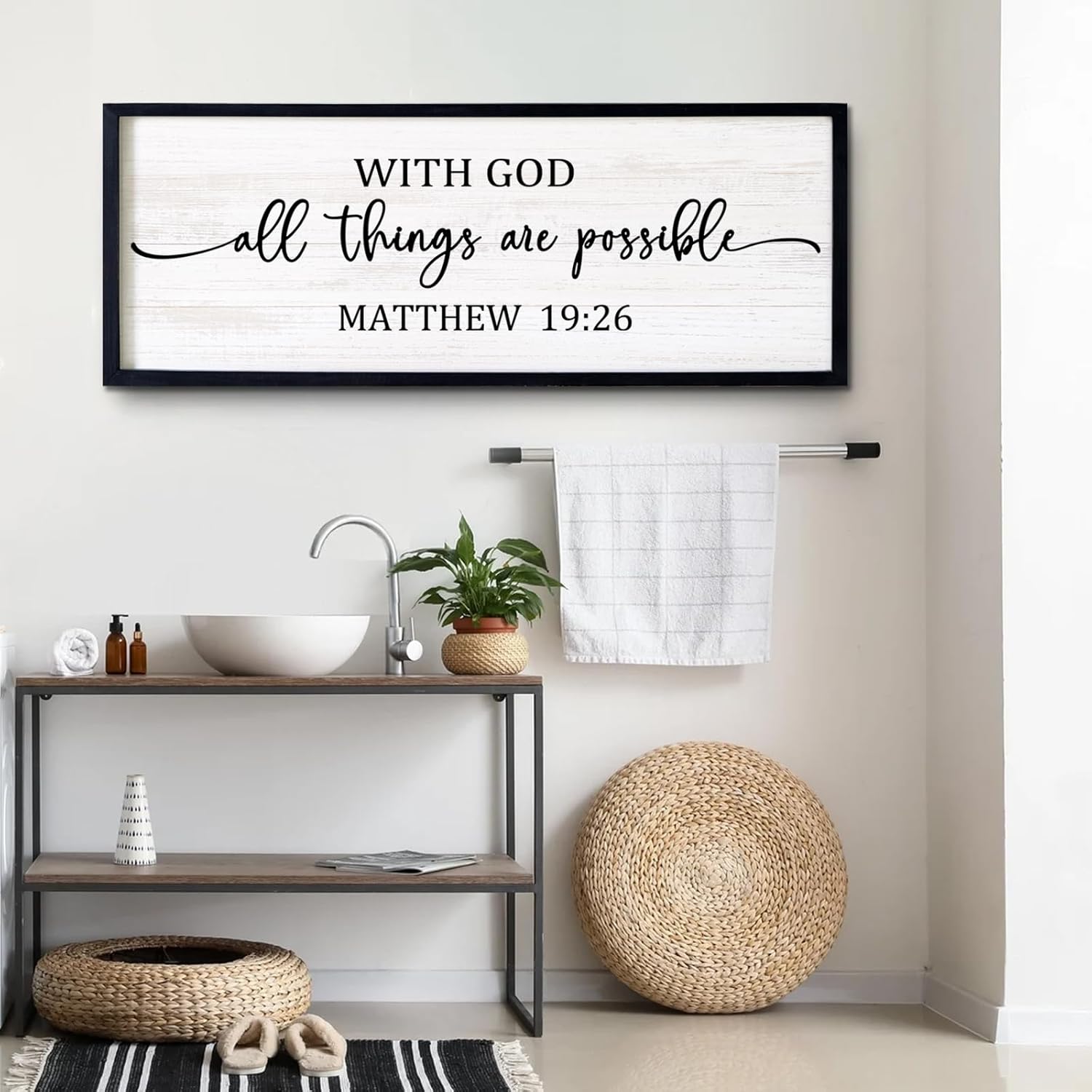 With God All Things are Possible Framed Wall Art, 40''×15'' Positive Holy Religious Rustic Bible Verse for Christian God Jesus Christ Prayer, Vintage Horizontal Inspirational Catholic Scripture Decor