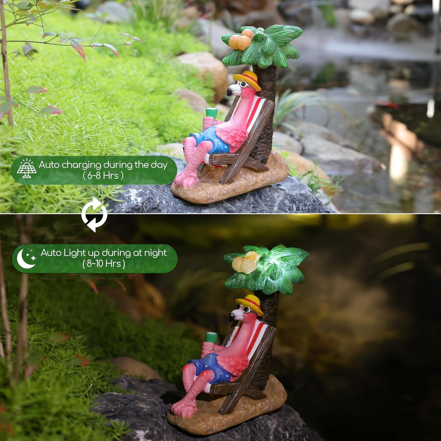 - 【HIGH QUALITY & HAND-PAINTED】This flamingo solar lights is hand made by durable long-lasting resin, highly-detailed and waterproof outside decorations for yard. tiki decor measures 8.6”Wx4.2”Dx9.5H
