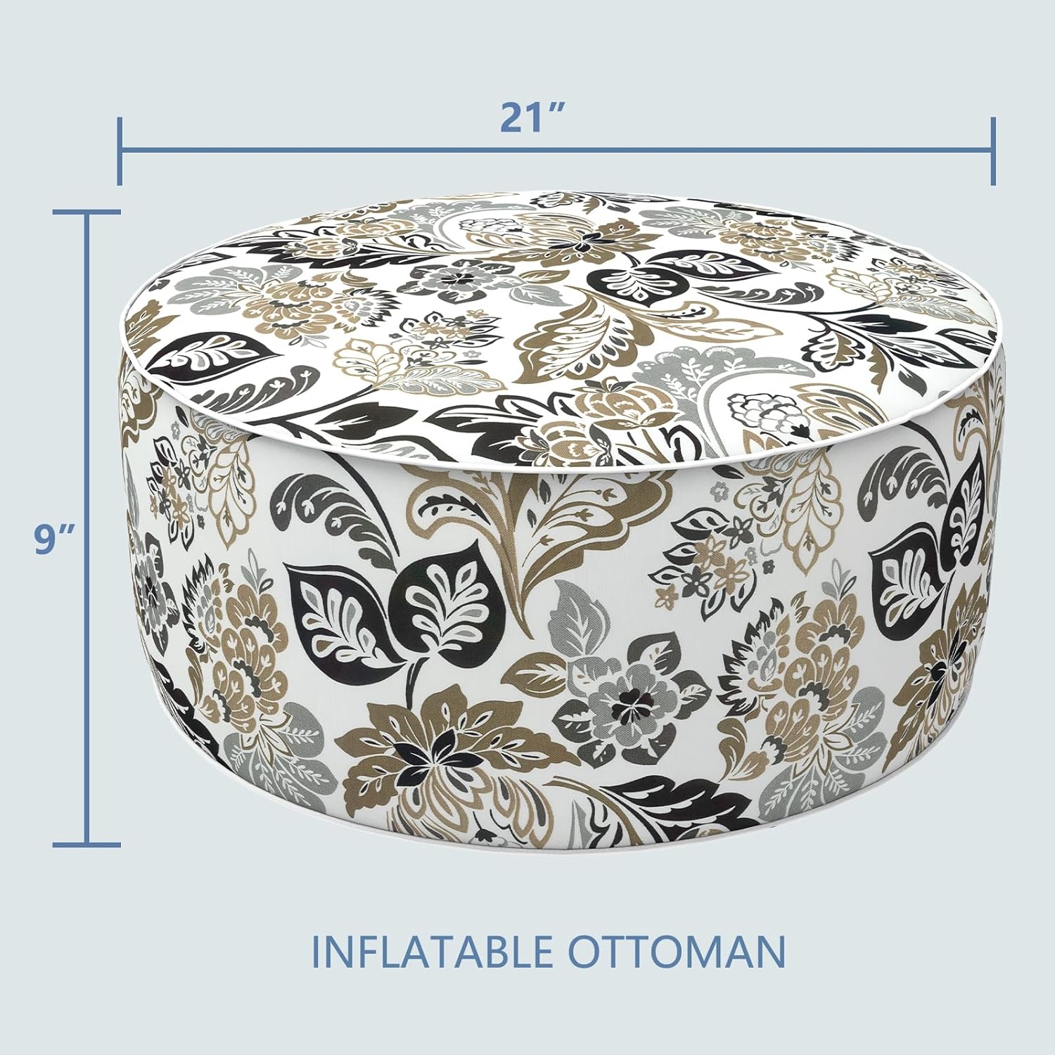 - PACKAGE INCLUDING: FOOT PUMP IS NOT INCLUDED. This value bundle come with 1 pcs indoor outdoor inflatable ottoman measures D21” x H9” (53 x 23cm). Made of durable and soft polyester fabric, sturdy inflatable PVC liners.