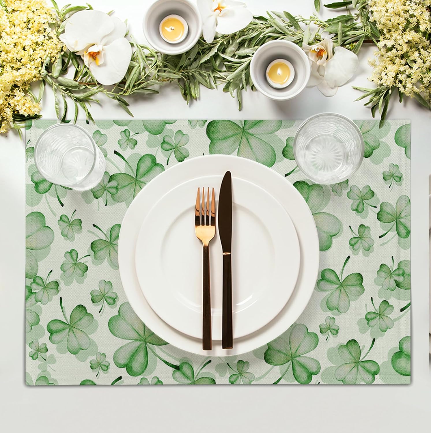 - TABLE DECORATION: Watercolor shamrocks St Patrick's Day decorative table placemats feature high-definition printing technology for crisp, clear patterns and vibrant colors; watercolor green placemats with a lucky clover pattern; unique and eye-catching seasonal patterns add charm to St. Patrick's Day placemats, creating a festive atmosphere for your party