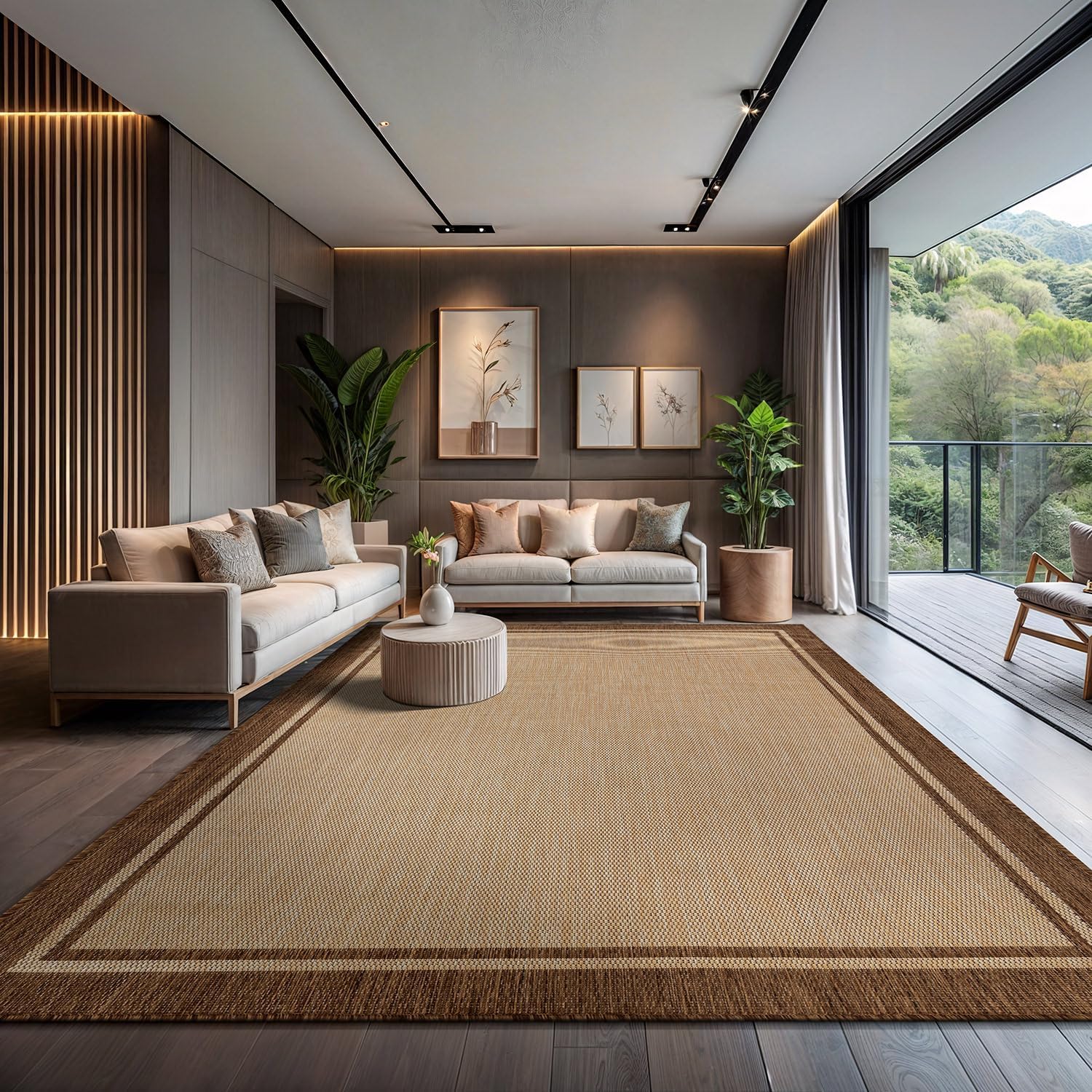 CAMILSON Indoor Outdoor Rug, 10x14 Bordered Natural Brown Modern Large Area Rugs for Indoor and Outdoor Patios, Kitchen and Hallway Mats, Washable Porch Deck Outside Carpet (Jute, 10 x 14)