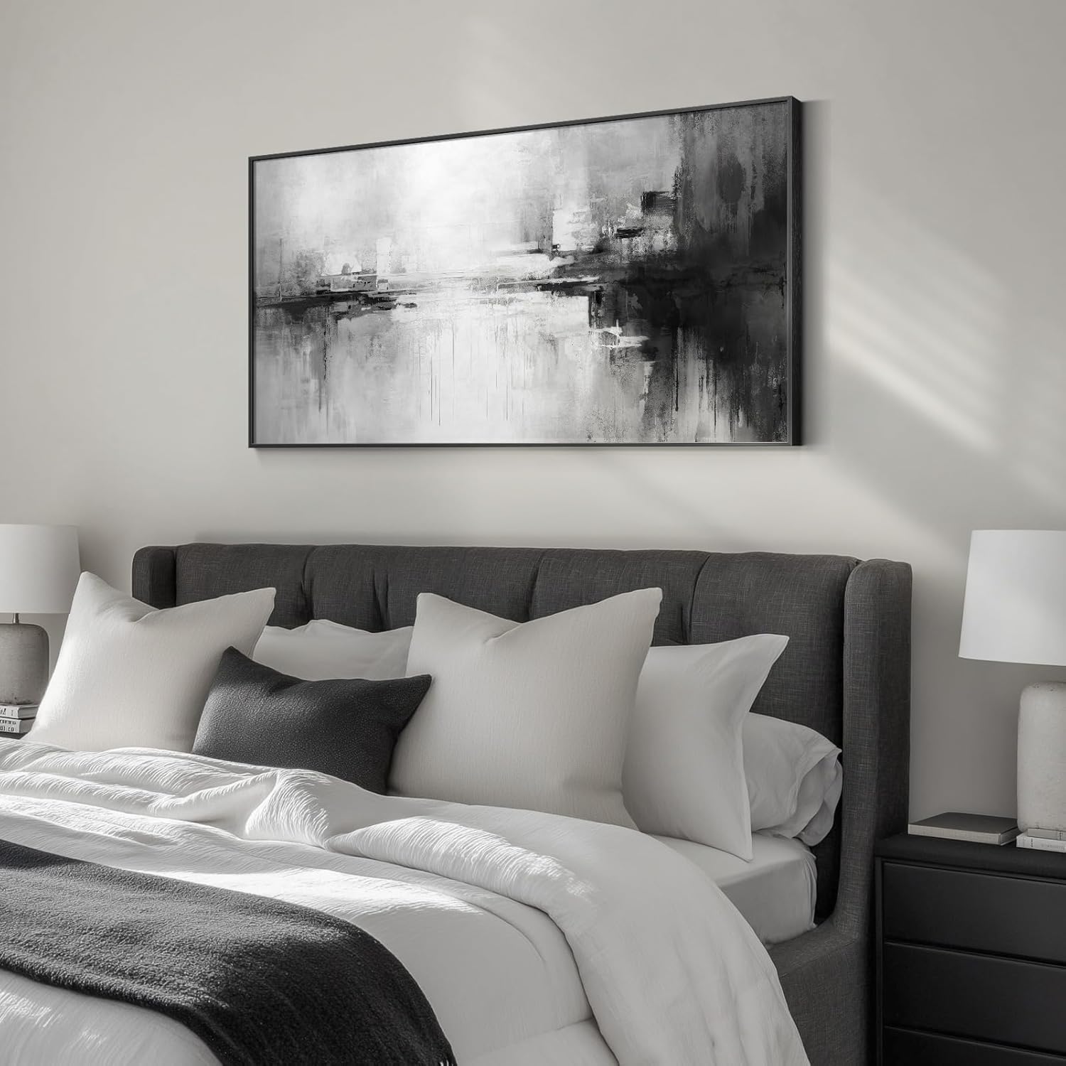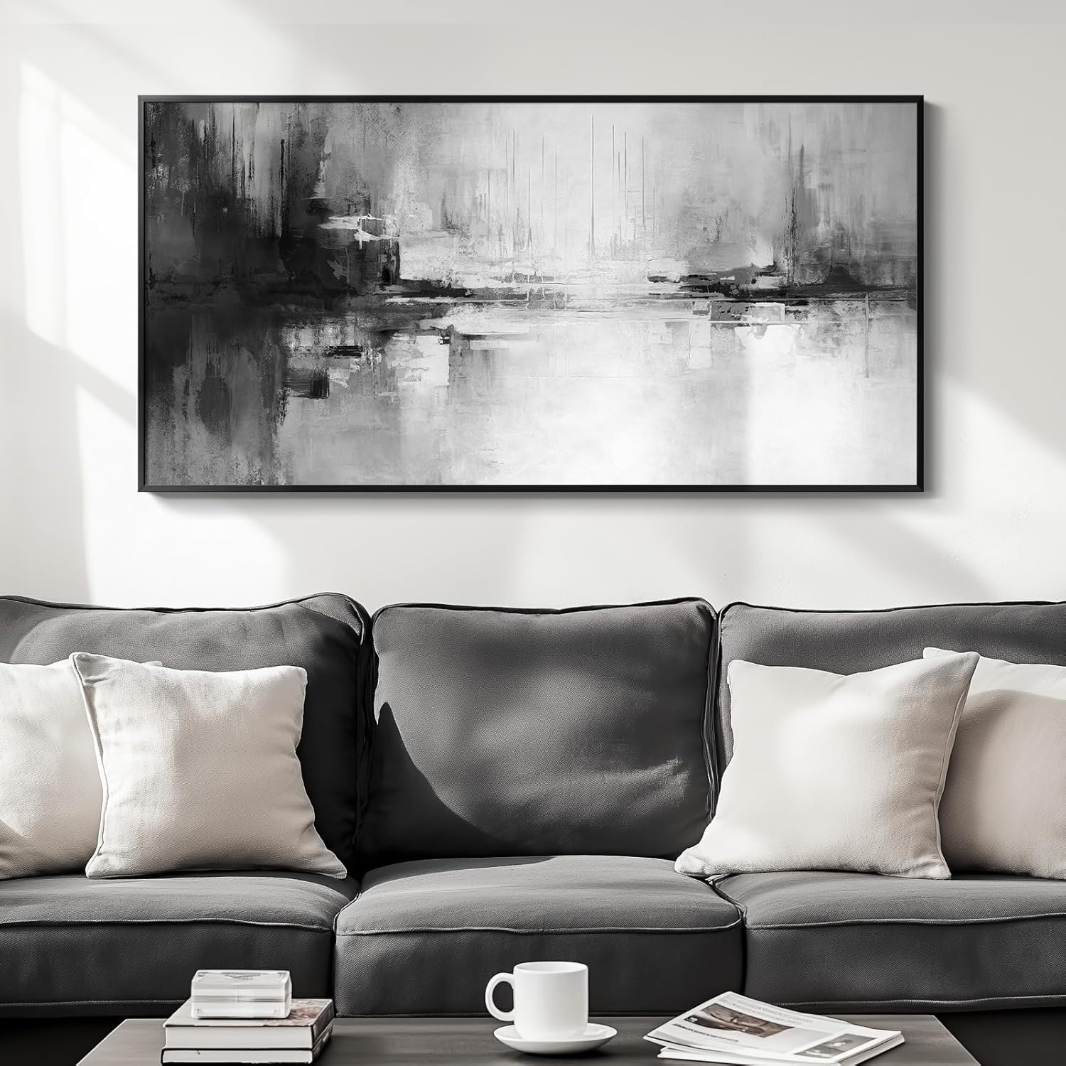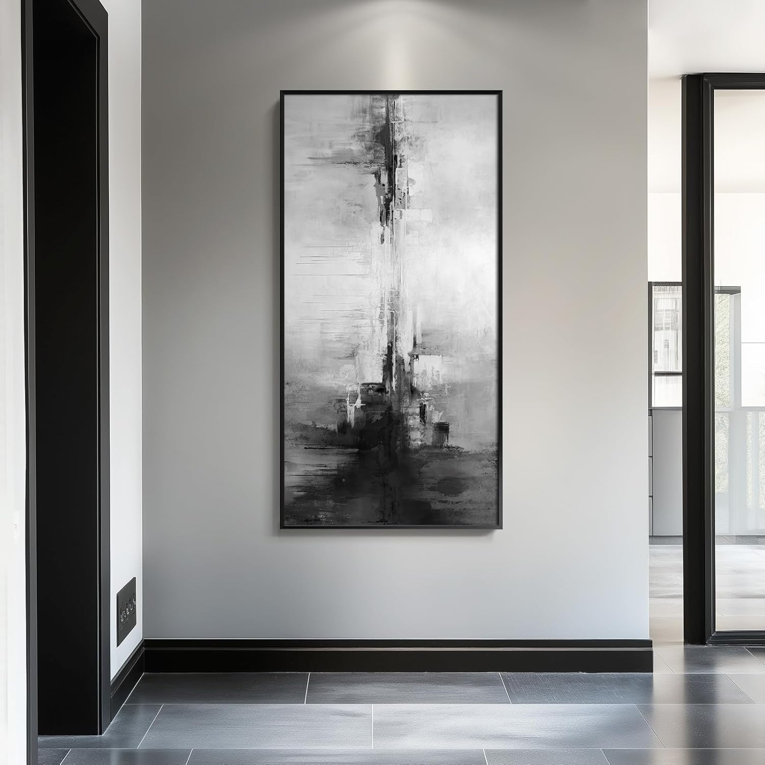 - [Abstract Wall Art]: This large abstract wall art uses a minimalist black and white color scheme to create a modern and simple feel. Despite the simplicity of the overall tone, the rich layers in the picture give the work a unique visual appeal. The classic black and white tones convey elegance and tranquility and are suitable for wall decoration in living room, hallway, stairwell, dining room, bedroom, study room, kitchen, office and bathroom to add a modern and artistic atmosphere to any environment
