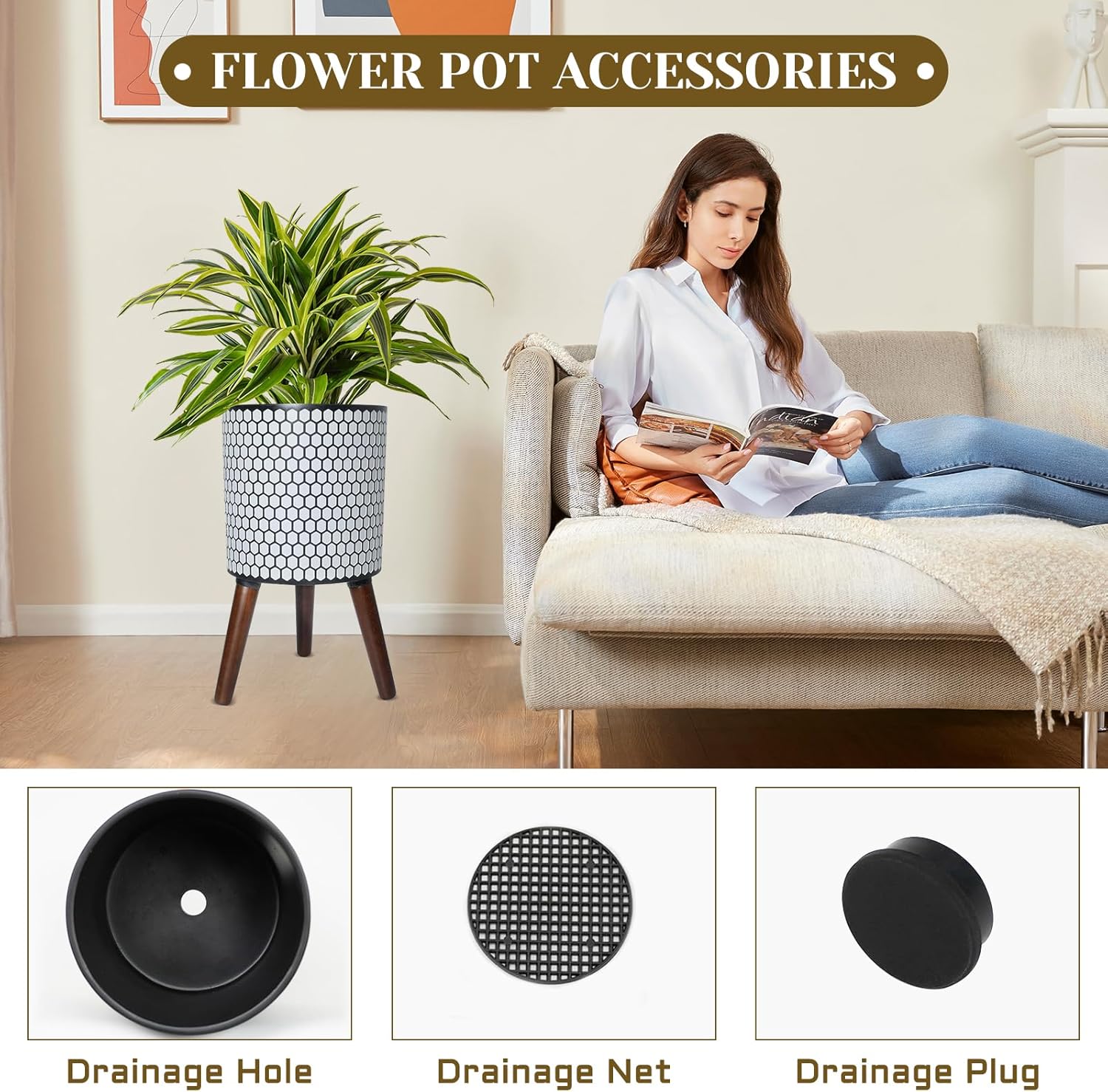 Flower Pot with Legs Tall Flower Pot with Drainage Holes for Indoor and Outdoor Decorative Planting (White Black Honeycomb, 10 Inches)