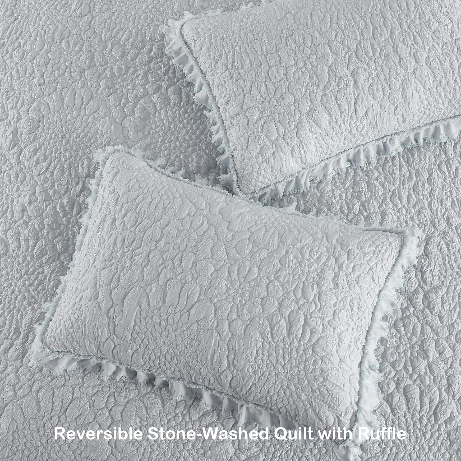 Light Blue Ruffled Quilt King Size, Stone-Washed Microfiber Lightweight Crinkled Farmhouse Rustic Shabby Chic Bedding Set, 3 Pieces Reversible Bedspread Coverlet with Pillow Shams for All Season