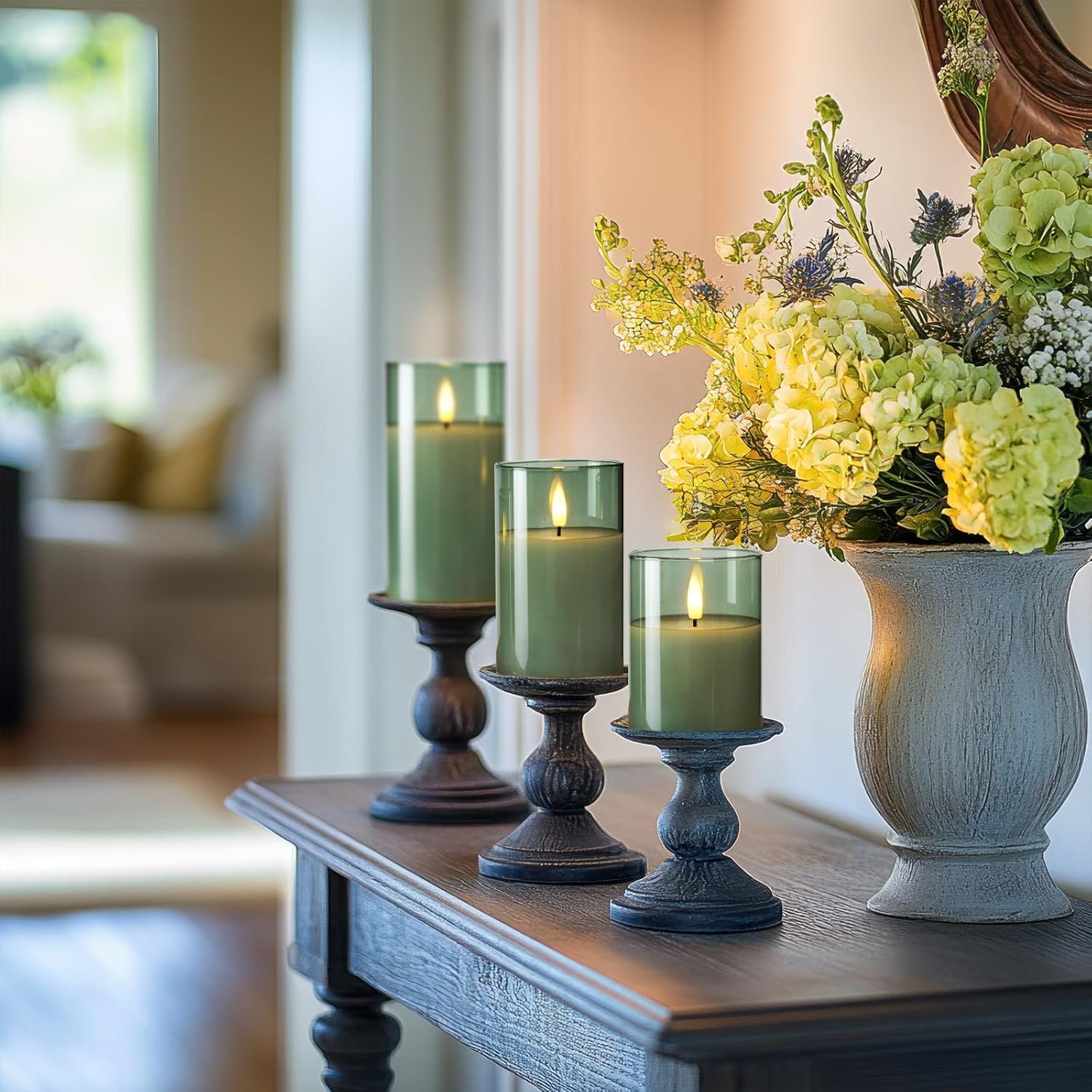 Amagic Green Glass Flameless Candles with Remote and Timer, Real Wax Battery Operated Candles, Flickering Electric LED Pillar Candles for St. Patrick's Day, Christmas Party Decor, Set of 3