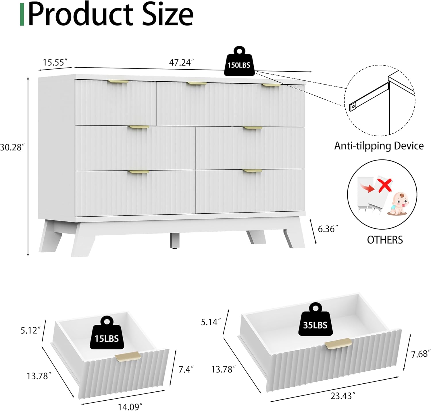 Fluted Dresser for Bedroom with 7 Drawers, 48" Wide Modern Chest of Drawers with Metal Handle, Wooden Dresser TV Stand, Wood Closet Clothes Storage Organizer for Living Room, Hallway, White