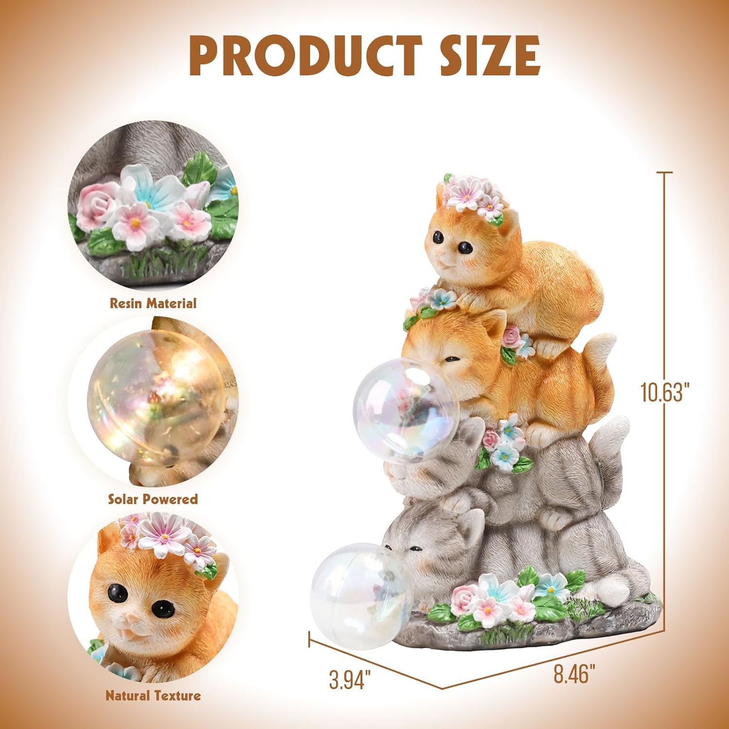 - Unique Design: This solar cat garden statue is a cozy scene of four cute kittens stacked together blowing bubbles, seamlessly blending the playful charm of feline grace with the enchantment of subtle illumination.