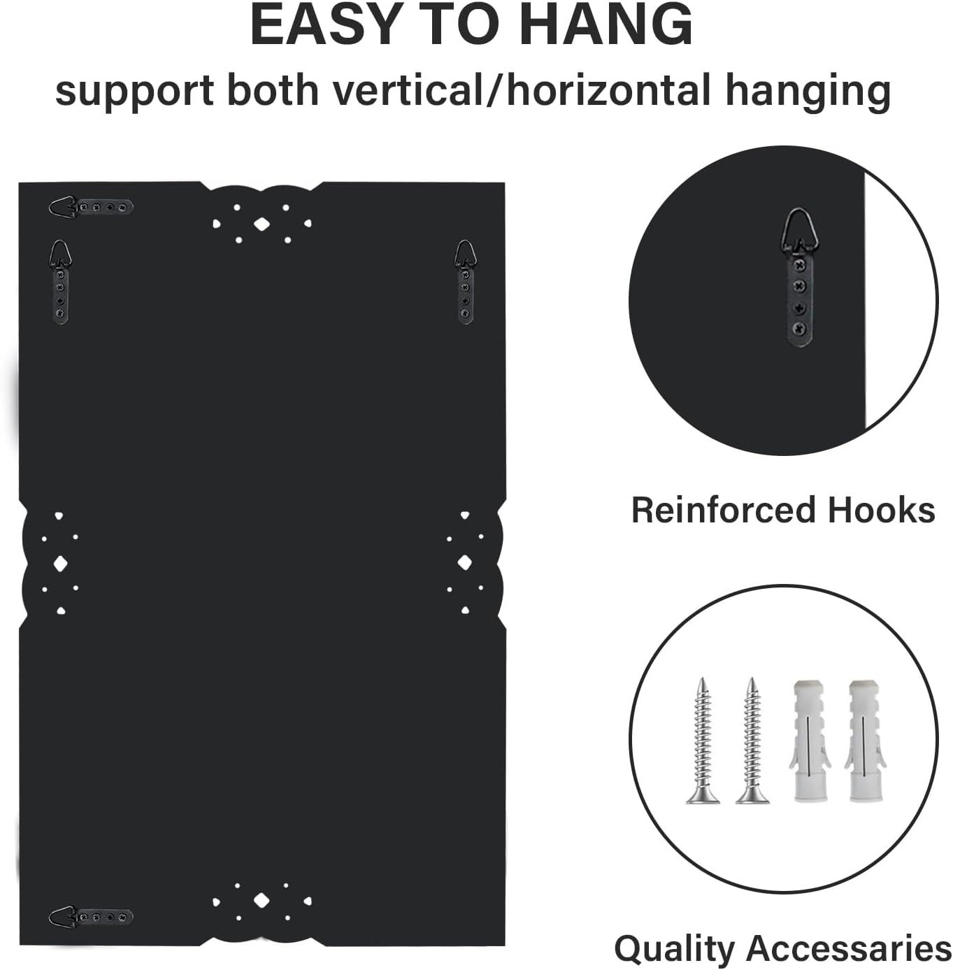 - Easy to Hang: This entryway mirror comes with all the necessary mounting hardware, you can easily hang and style your space in few minutes. Equipped with 4 pre-installed hangers on the backboard, it allows you to hang the mirror horizontally or vertically according to the space.