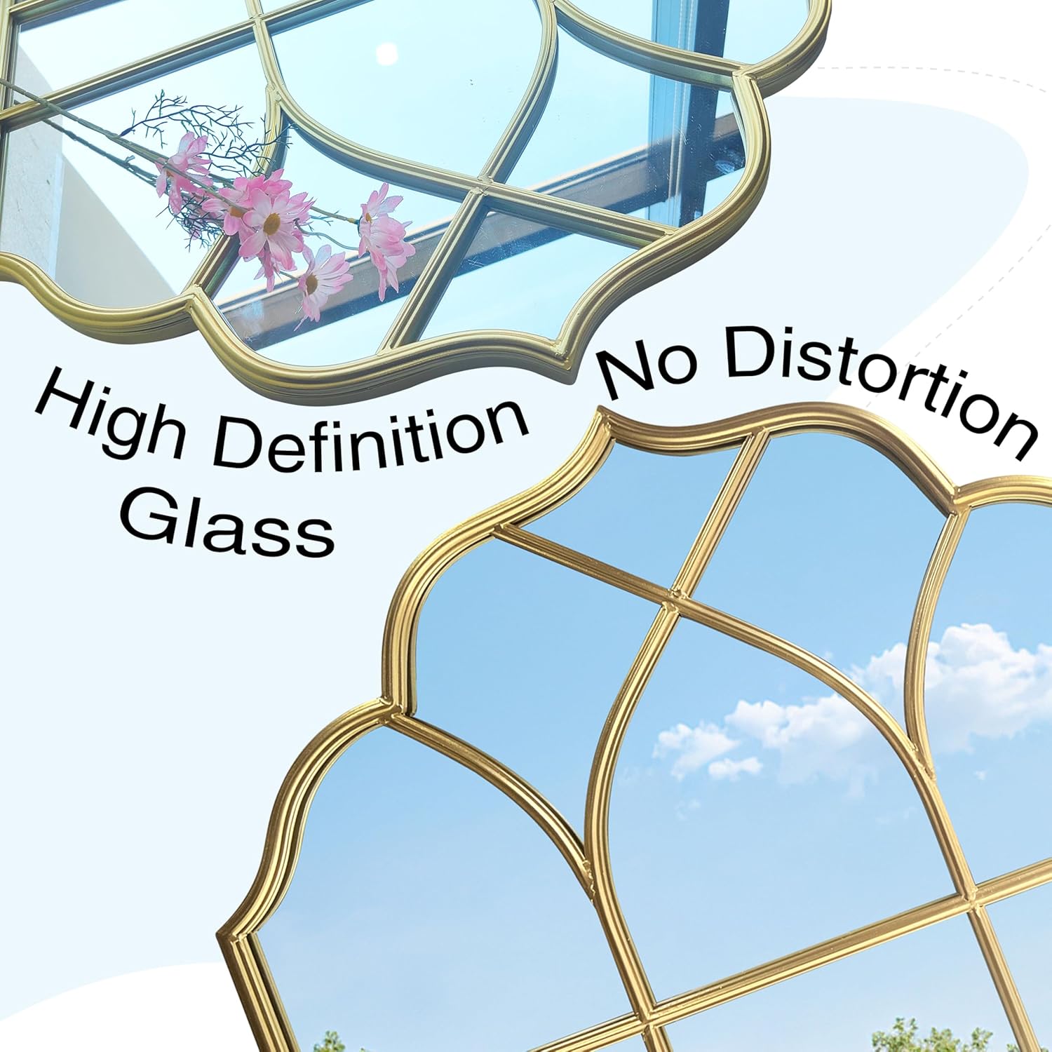 - Thickened Glass& NO Distortion: This gold frame mirror window is designed with HD glass to deliver a clear reflection with no distortion and better to brighten the space you place. High-definition glass is thickened and packaging is upgraded to further minimize window mirror breakage.