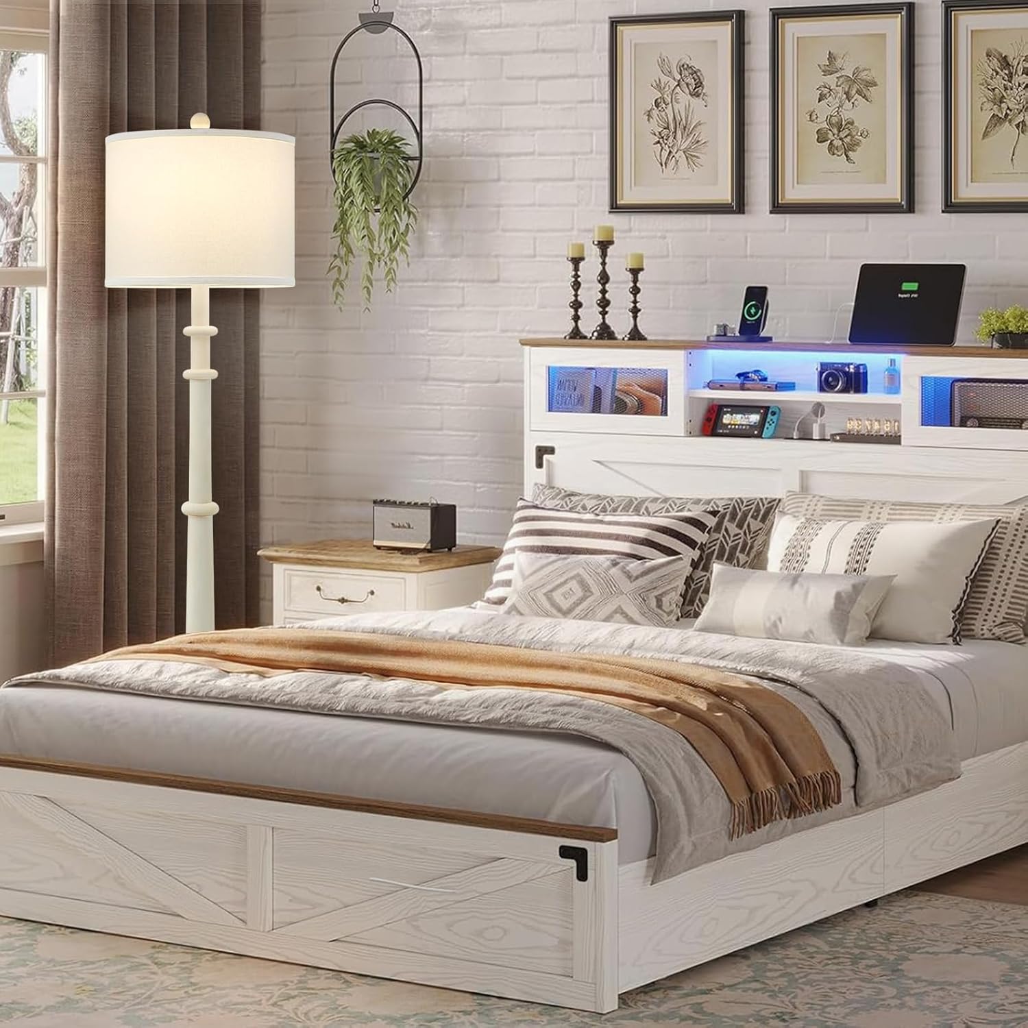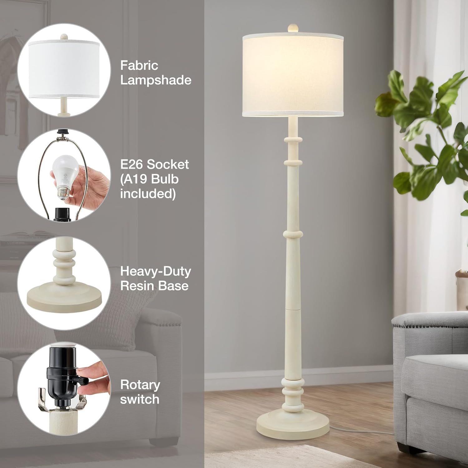 - ๐๐๐ซ๐ฌ๐๐ญ๐ข๐ฅ๐ ๐๐๐ฌ๐ข๐ง ๐ ๐ฅ๐จ๐จ๐ซ ๐๐๐ฆ๐ฉ - Discover versatility with our farmhouse floor lamp, expertly molded from resin for lasting beauty and reliability. Its classic design, complemented by a crisp white fabric drum shade, seamlessly integrates into any decor scheme from modern to traditional. Ideal for creating a cozy atmosphere in bedrooms, living areas, or reading corners. Simple assembly ensures hassle-free setup