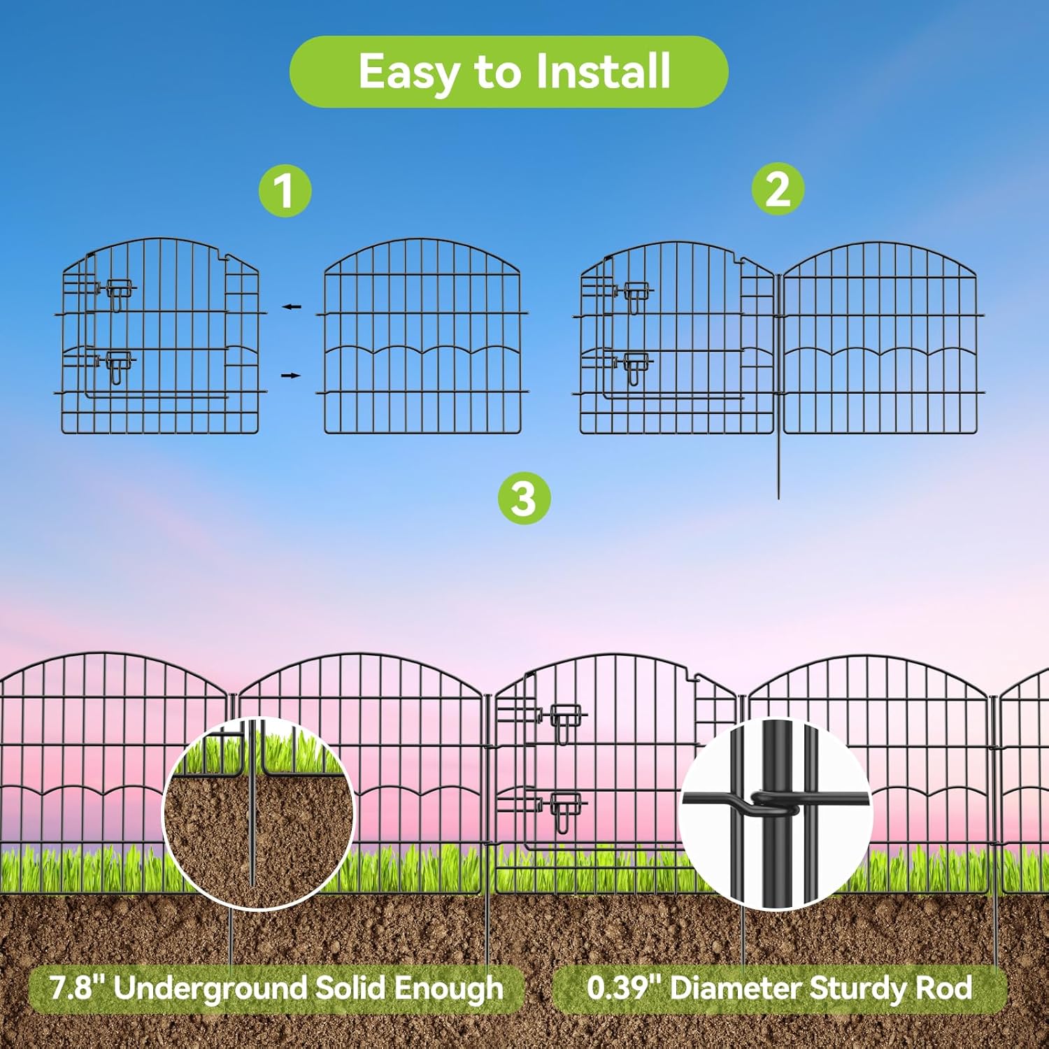 - Fence Size: Each garden fence panel measures 24"W x 24"H with a 1.45" gap, while the 7 metal stakes are 0.39" in diameter and 27.6" tall (7.8" into the soil) for secure anchoring in the ground. The removable fence includes 5 panels + 1 gate, connecting 6 panels, with a total length of 12 feet. The no-digging fence can be added or removed freely, giving you complete flexibility to customize your area.