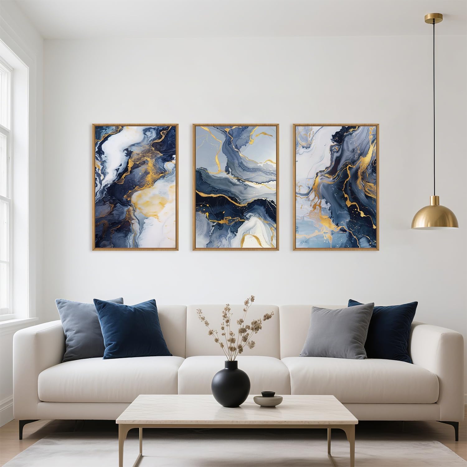 Celestdeco Blue Abstract Framed Canvas Wall Art Set, Blue Golden Aesthetic Wall Decor, Navy Blue Gold Wall Painting, Neutral Modern Art Print for Living Room, Bedroom, Dining Room, Office 24"x36"x3