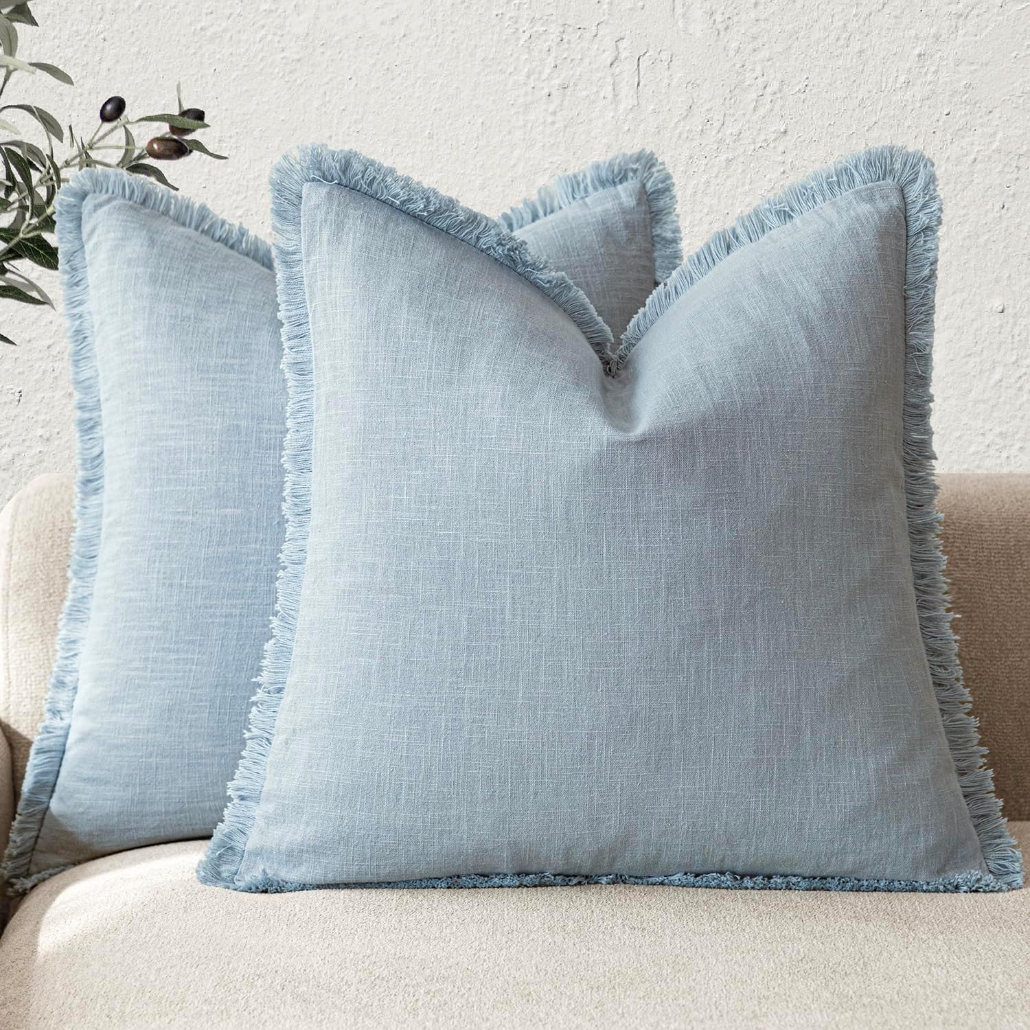 Foindtower Set of 2 Decorative Linen Fringe Throw Pillow Covers Boho Farmhouse Cushion Cover with Tassels Soft Accent Pillowcase for Couch Chair Sofa Bed Living Room Home Decor,24×24 Inch,Sky Blue