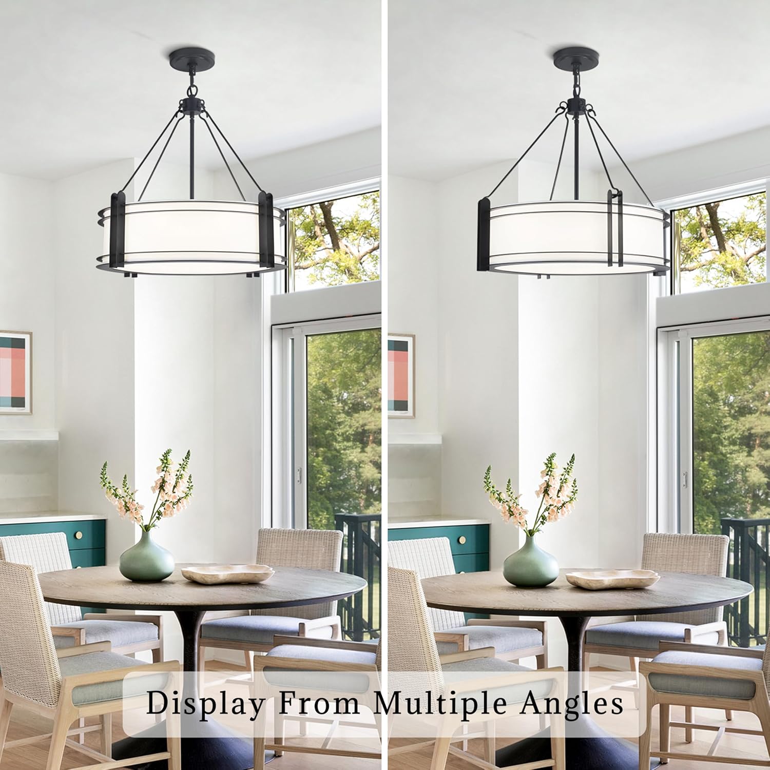 - 【Modern Drum Chandelier】Transform your space with the black farmhouse chandelier,a sleek fusion of modern and classic styles.Featuring a black metal frame and white fabric shade,it casts a gentle,eye-friendly glow.This drum chandelier is Ideal for kitchen island,dining rooms,living room or bedroom,adding a touch of warmth and elegance to any decor