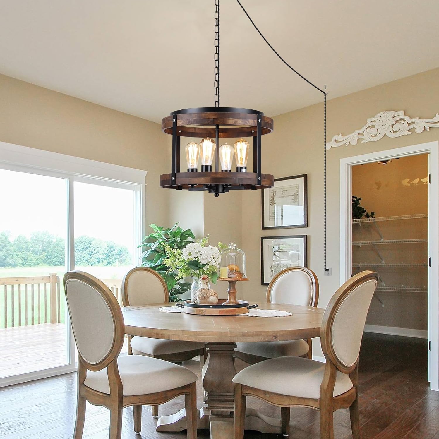 4-Light Large Rustic Farmhouse Plug in Pendant Light Fixture with Adjustable Chain, Dimmable Switch, 16.5 inch Oak Wood Drum Hanging Lamp for Dining Room Living Room Farmhouse Entry, Black