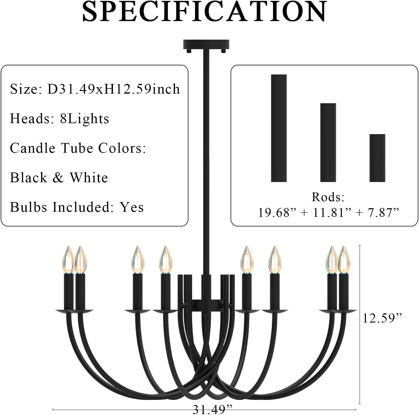- 【Specification】 Size: D31.49xH12.59inch / D80xH32cm. The Length of Pendant Rods: 39.37inch / 100cm (Adjustable). The Rods: 7.87inch + 11.81inch + 19.68inch. Heads: 8Lights. Color: Black. Metal Tubes Color: Black + White (Includes Black and White Colors Metal Tubes). Lamp Socket: LED E12. Emitting Color: Warm White 3000K. Bulbs Included: Yes. Wattage: 24W.