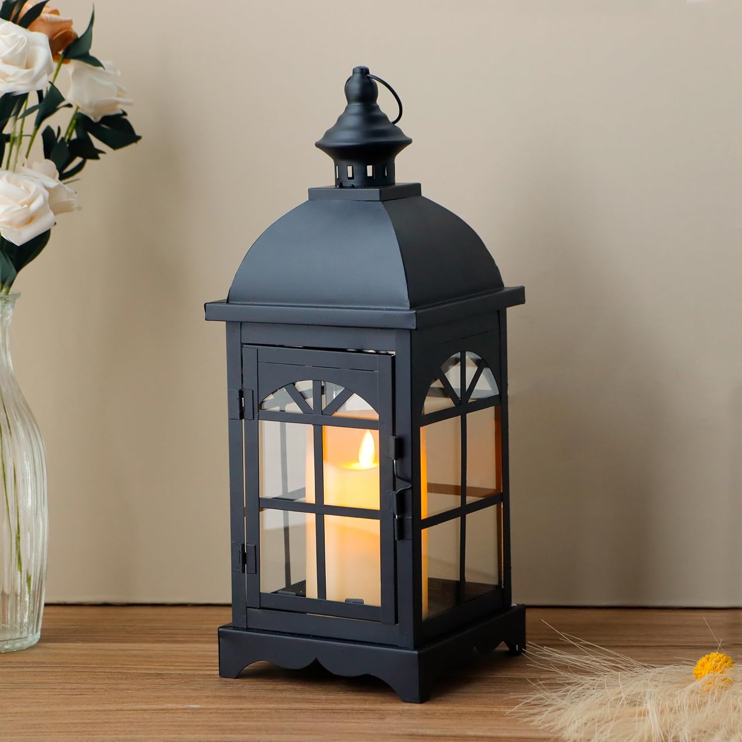 TRIROCKS Decorative Vintage Candle Lanterns 14.5" H Farmhouse Outdoor Hanging Lanterns with Tempered Glass for Porch, Balcony, Patio, Home, Centerpieces, Indoor, Outdoor(Black)