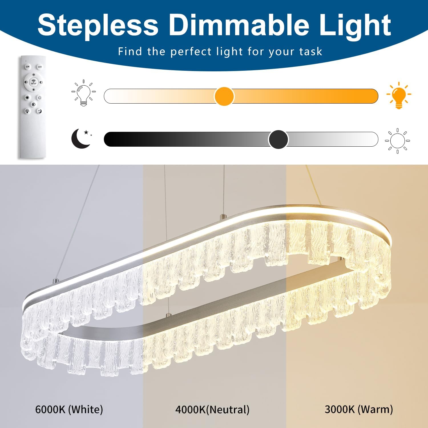- Dimmable LED Modern Chandelier: This modern LED linear light fixture adopts dimmable LED strip technology and is equipped with a remote control. You can freely adjust the brightness and color temperature of the light using the remote control. Dimming range: 5%-100%.But it does not support any dimmer switches, please do not use wall dimmer switches.