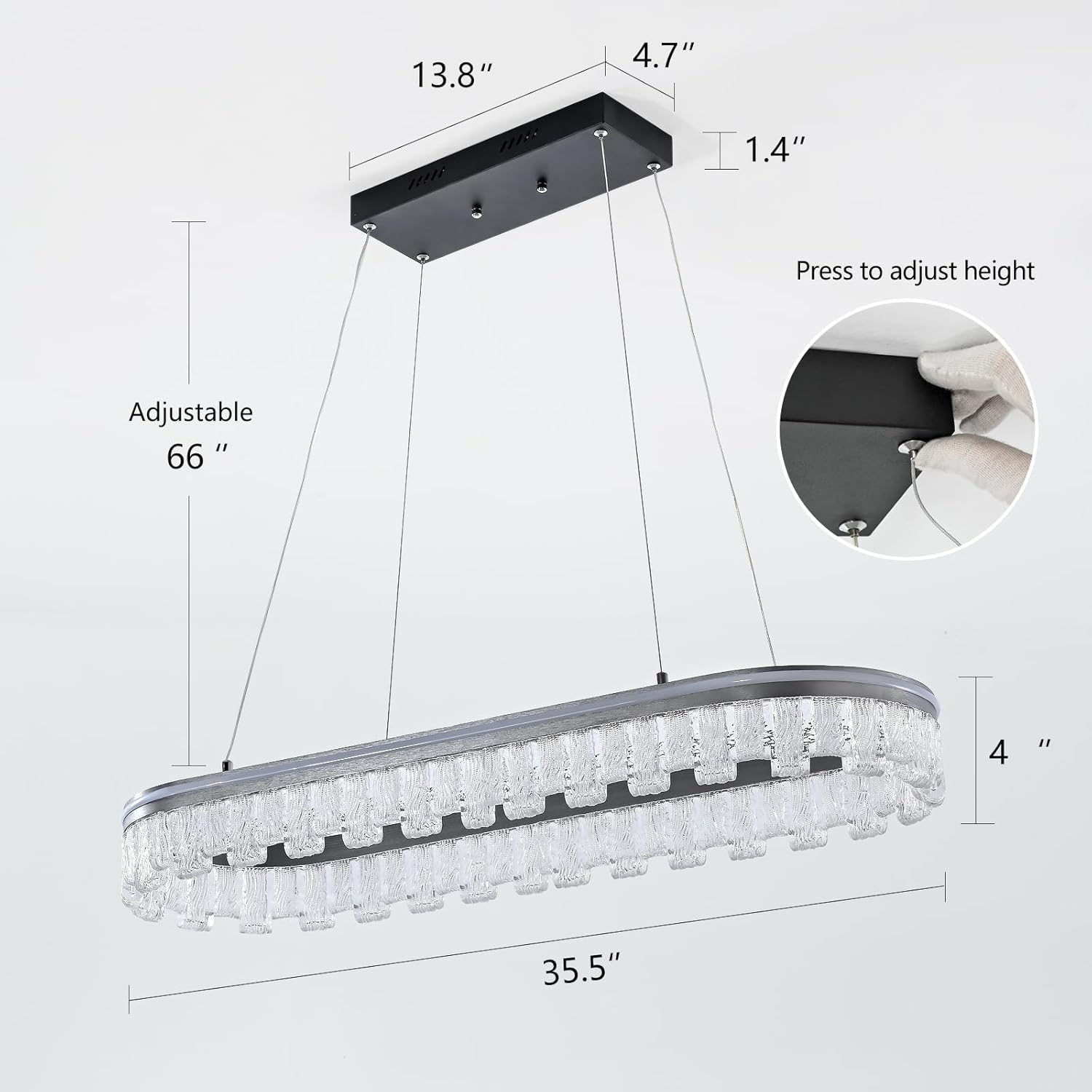 - Linear Pendant Light Size: 35.5 X 4.0 inch linear pendant light fixture, equipped with 66 inch (adjustable) suspension wire length, dimmable LED linear light fixture with sleek silvery gray aluminum construction for modern aesthetic appeal