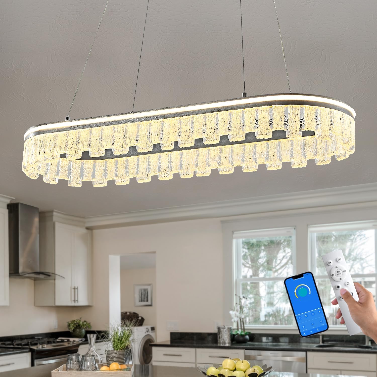 - Modern Design Kitchen Island: Elegant elliptical runway-style modern pendant light kitchen island with crystal-clear hanging elements and sleek silvery gray aluminum frame, perfect for contemporary spaces