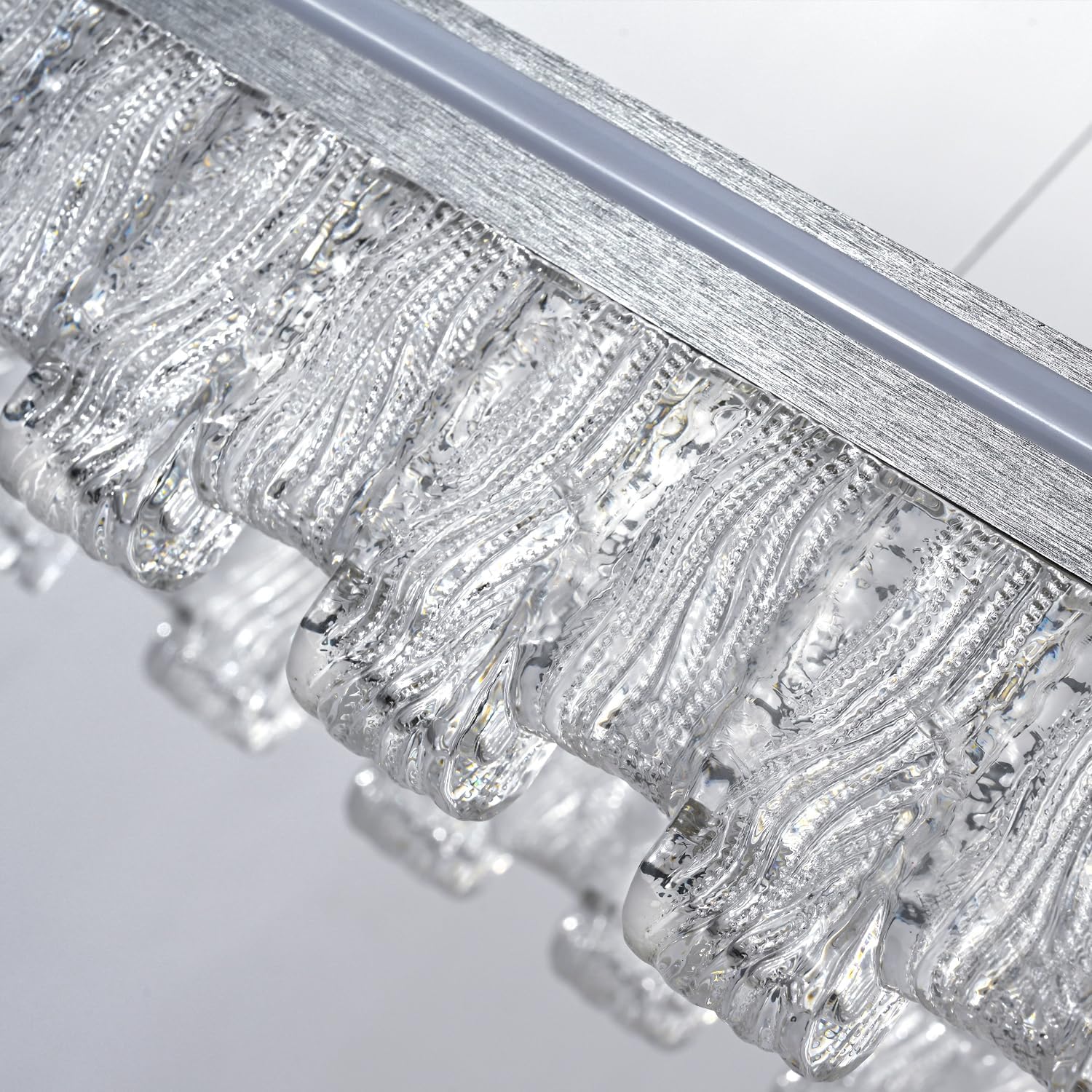 - High Quality Lnear Pendant Light: This restaurant island light features a silver grey brushed high-quality aluminum frame and decorative crystal elements, energy-saving LED light source, creating stunning light reflection and visual appeal