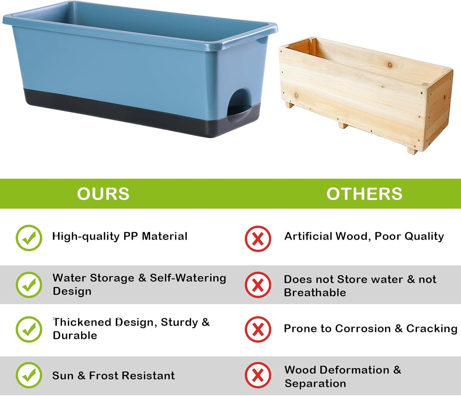 - 【Premium & Durable】The planter pots are made of high quality PP material and has been thickened to bear up to 300KG (660LB). This window box planter is sturdy, wear-resistant and durable. It can be exposed to light, wind, and sunlight for long periods of time, with a lifespan of decades. It is an excellent planter box for both indoor and outdoor.