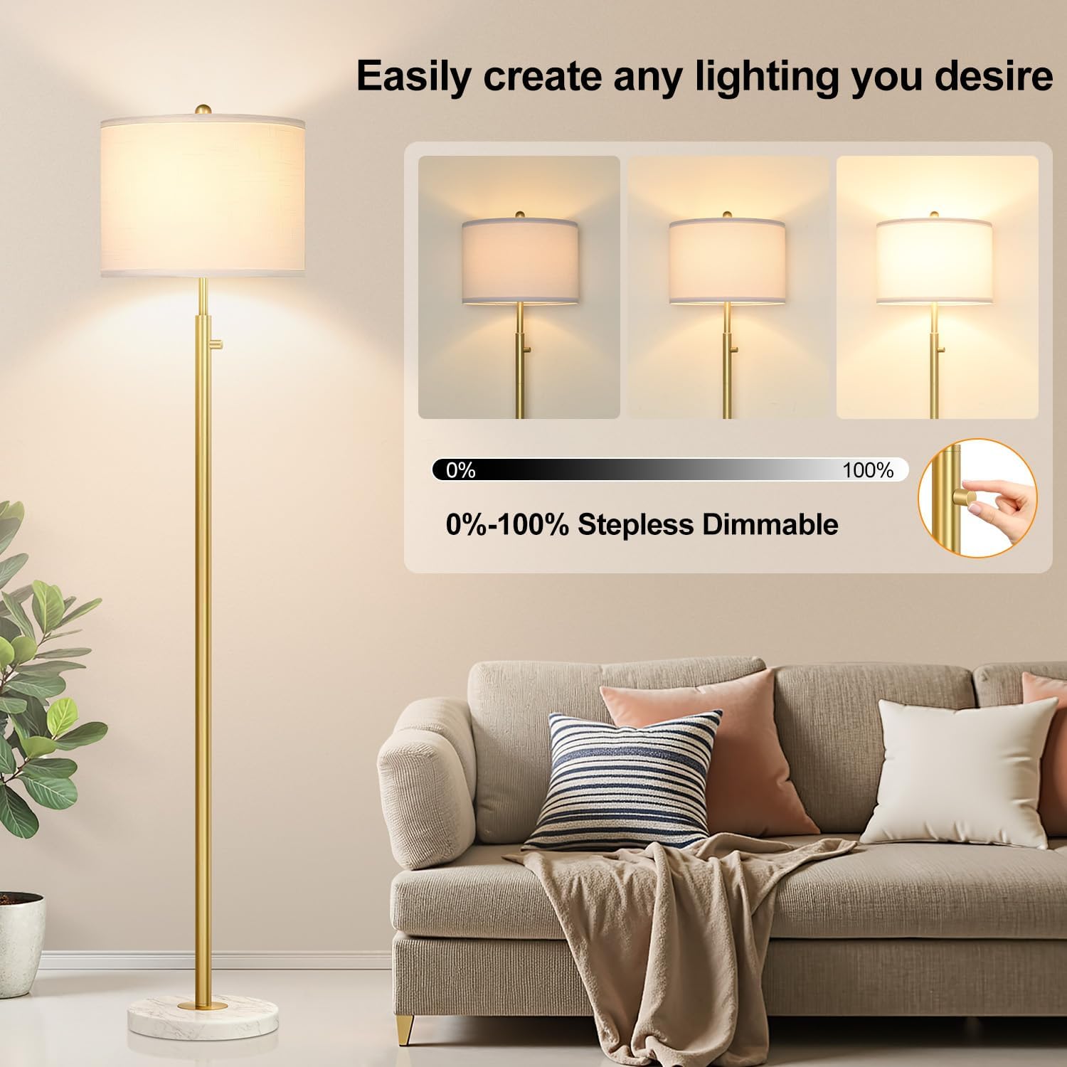 【Upgraded】Dimmable Gold Floor Lamps for Living Room, 11W LED Bulb Included, Modern Standing Lamp with Marble Base, Tall Pole Light with White Linen Shade for Bedroom Reading Office Corner Nursery