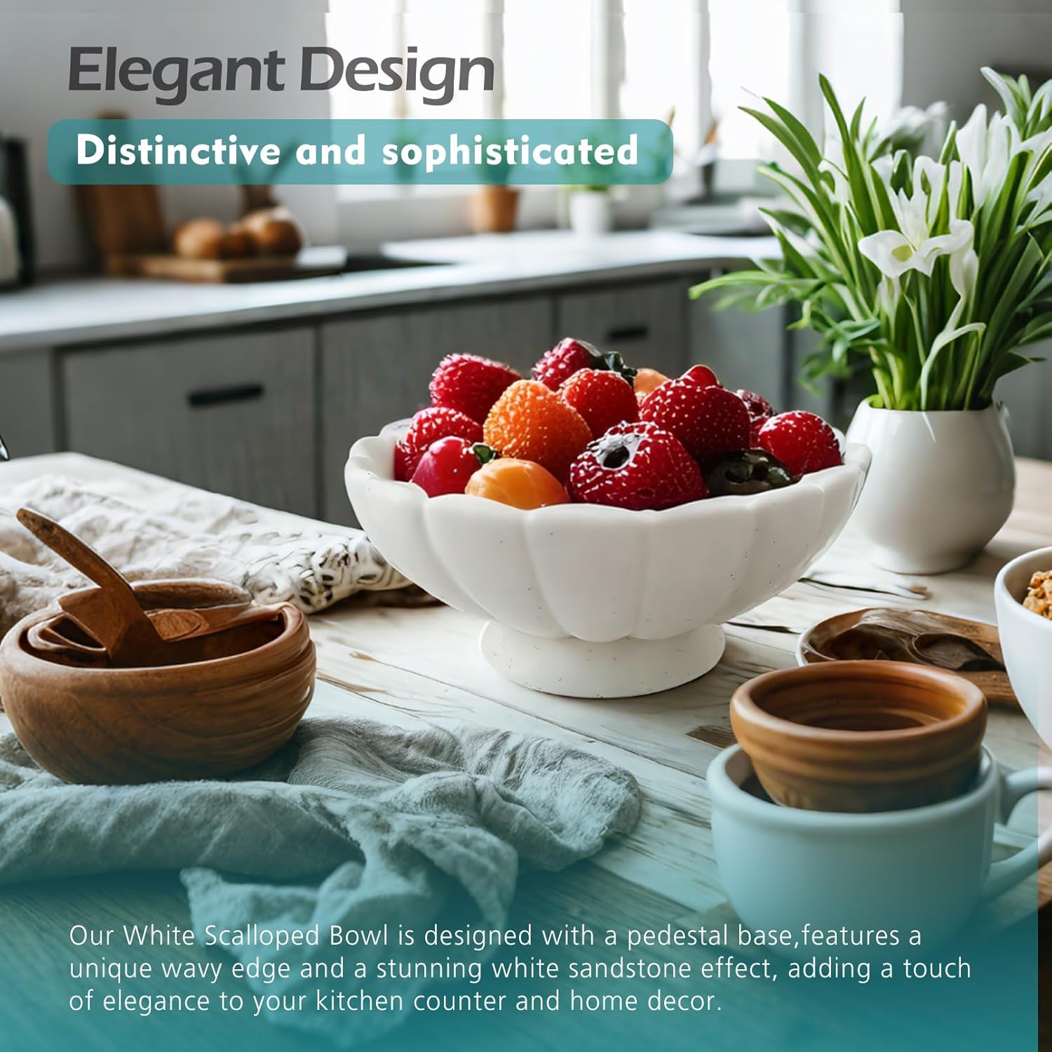 - Elegant Design: Our 8-Inch White Scalloped Ruffle Bowl is designed with a pedestal base,features a unique wavy edge and a stunning white sandstone effect, adding a touch of elegance to your kitchen counter and home decor. Perfect for serving fruits , serving salads or as a decorative centerpiece.