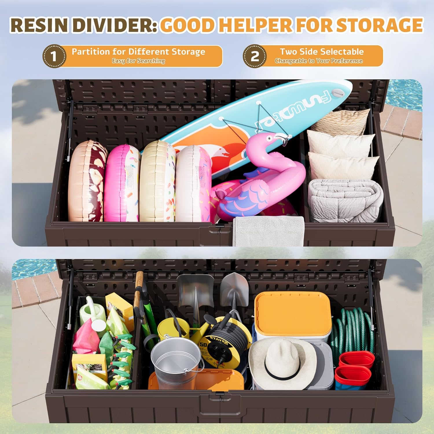 Flamaker Resin Deck Box 250 Gallon, Waterproof Imitation-Wood Lockable Storage Box with Separator Plate Outdoor Indoor, Garden, Patio Furniture for Tools&Pool Accessories (Deep Brown)