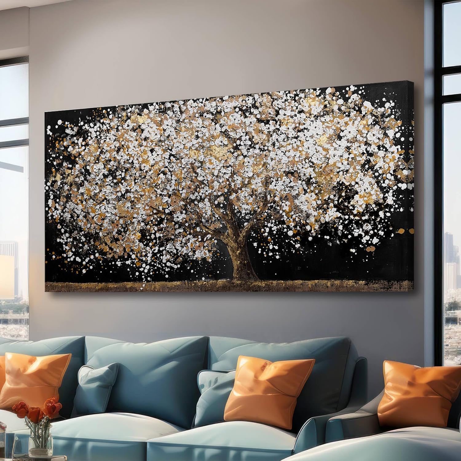 Large Wall Art for Living Room Gold Wall Decorations White Wall Pictures Tree Canvas Wall Art Decor Black Print Photos for Living Room Hotel 29"x58"