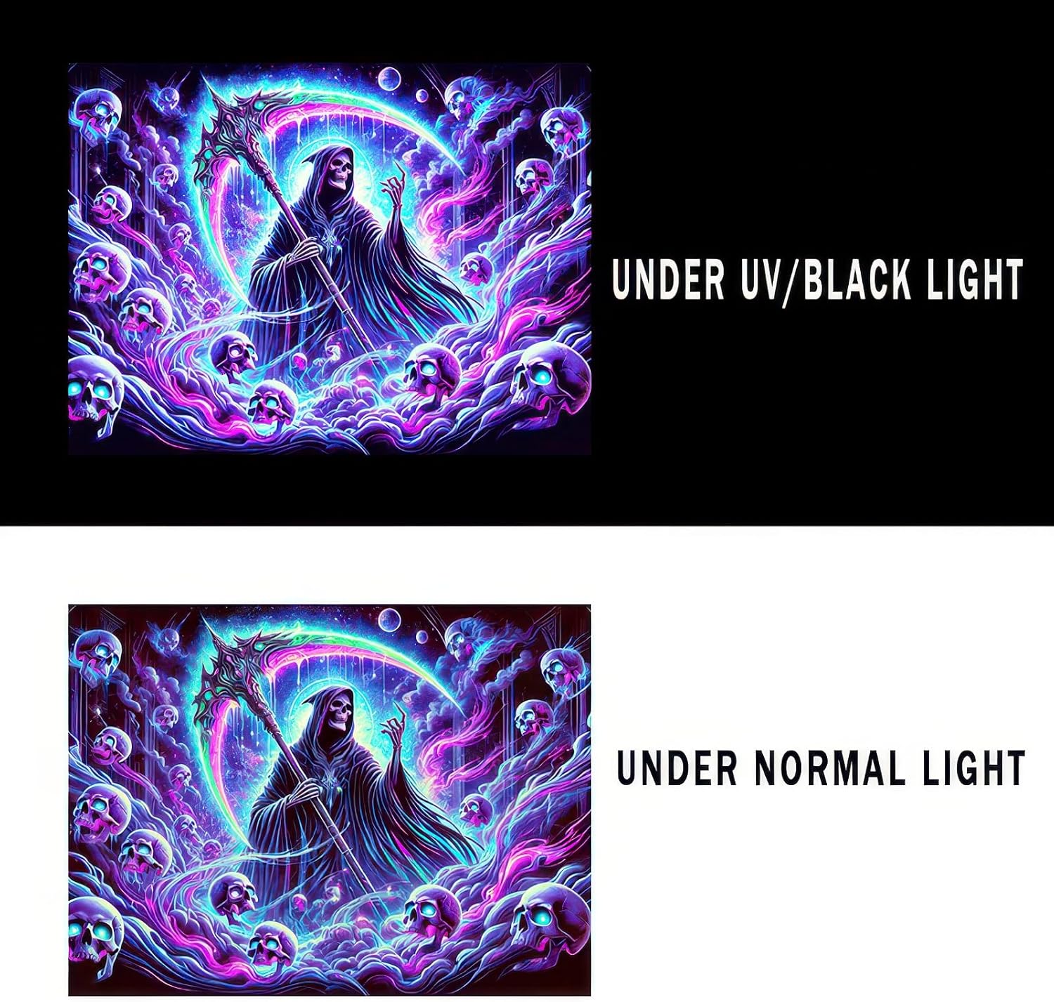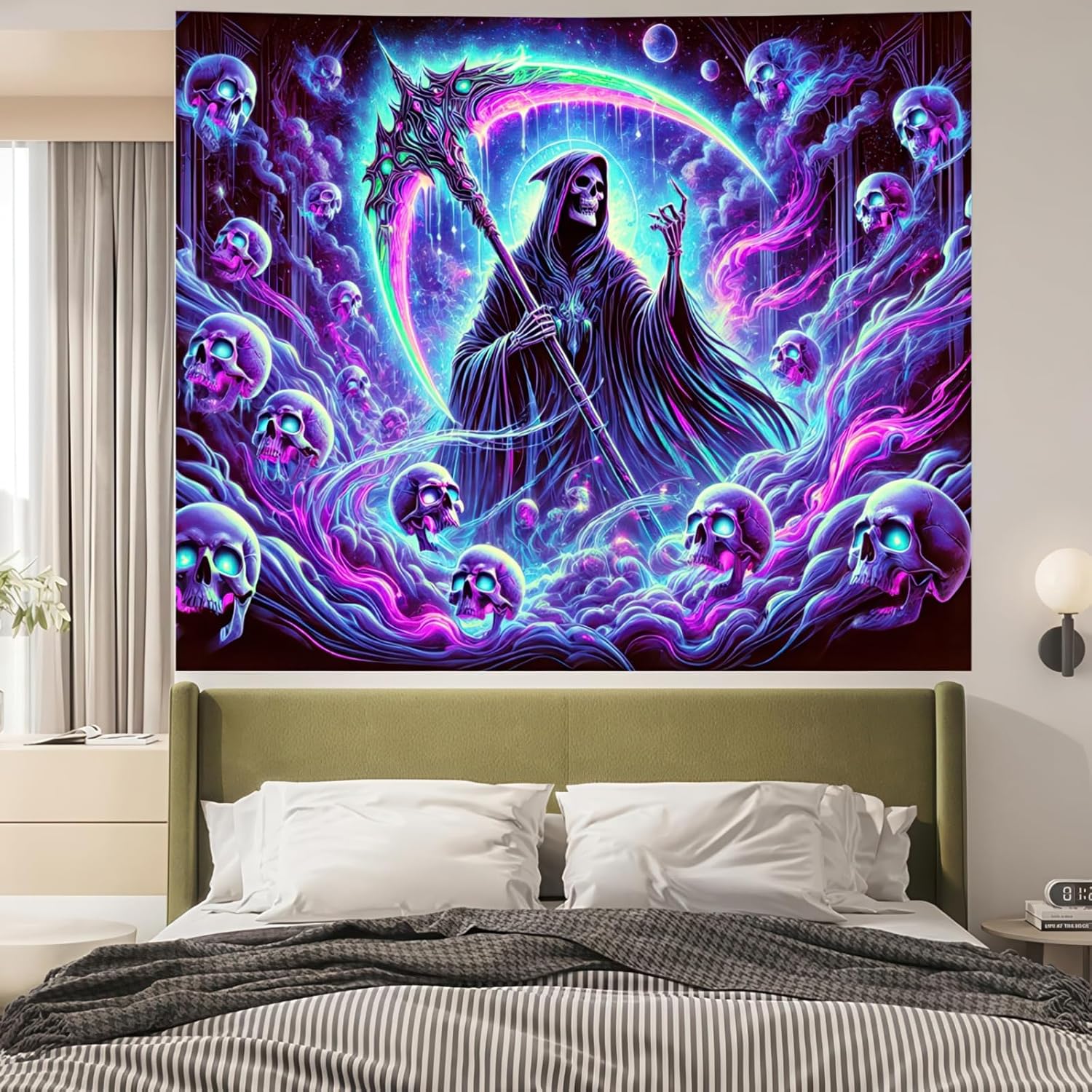 - 【Eerie Neon Grim Reaper Design】This blacklight tapestry showcases a powerful, neon-infused Grim Reaper surrounded by floating skulls in a cosmic, dreamlike setting. The bright pink, purple, and blue hues radiate intensity, creating a vivid and otherworldly atmosphere.
