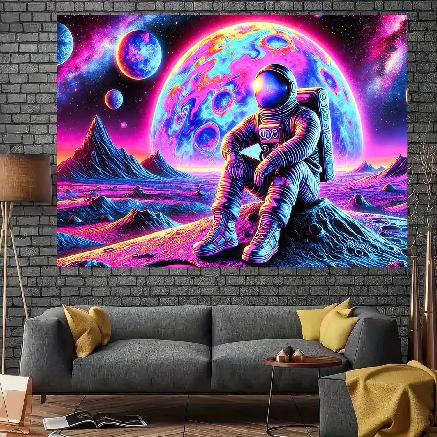 - Stunning Astronaut and Cosmic Art: This tapestry wall hanging showcases a captivating astronaut in a glowing, cosmic setting. The vibrant neon colors, planets, and dramatic mountain landscapes create a visually striking space adventure scene, perfect for any modern decor.
