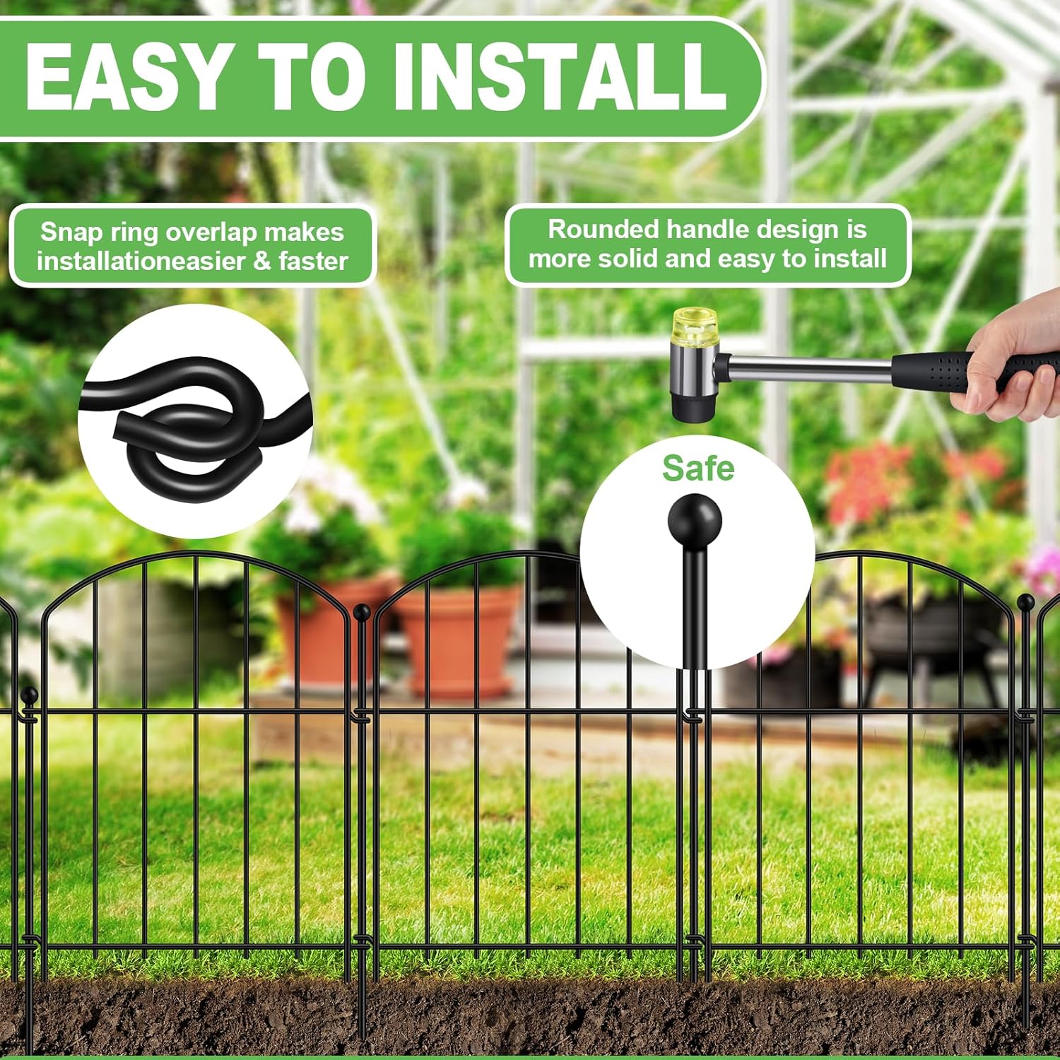 - 【More flexible Installation】Metal garden fence panels eliminating the need to hammer the fence itself and making it less susceptible to warping or damage. Each fence panel board is designed with snap circles that can overlap each other. Metal dog fence installation is simple and easy to put together a fence into any shape you want.