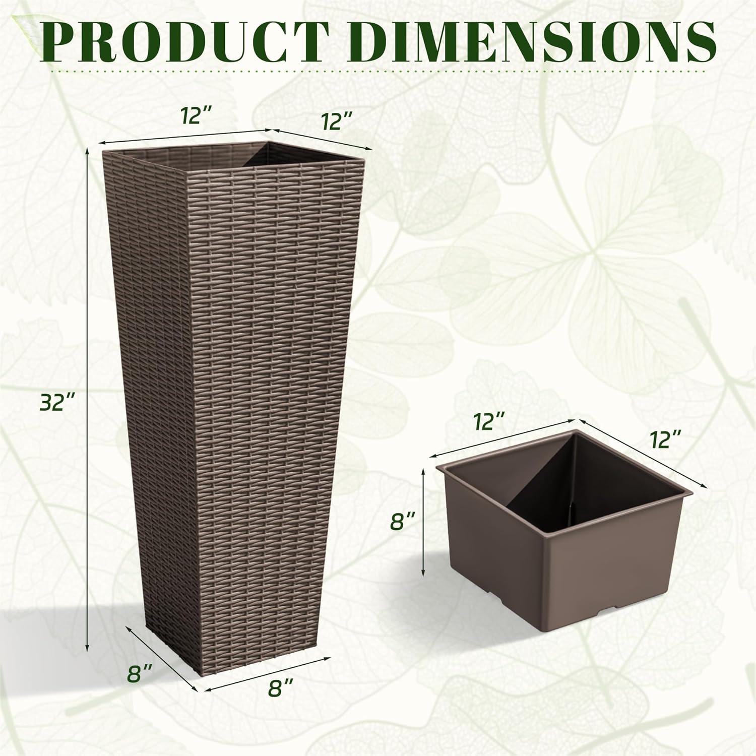 JUMMICO Set of 2 Resin Rattan Tall Planters for Outdoor Plants, Large Tapered Planters with Drainage Holes&Inner Trays, Flower Pots for Garden, Patio, Porch, Backyard (Brown, 32'')